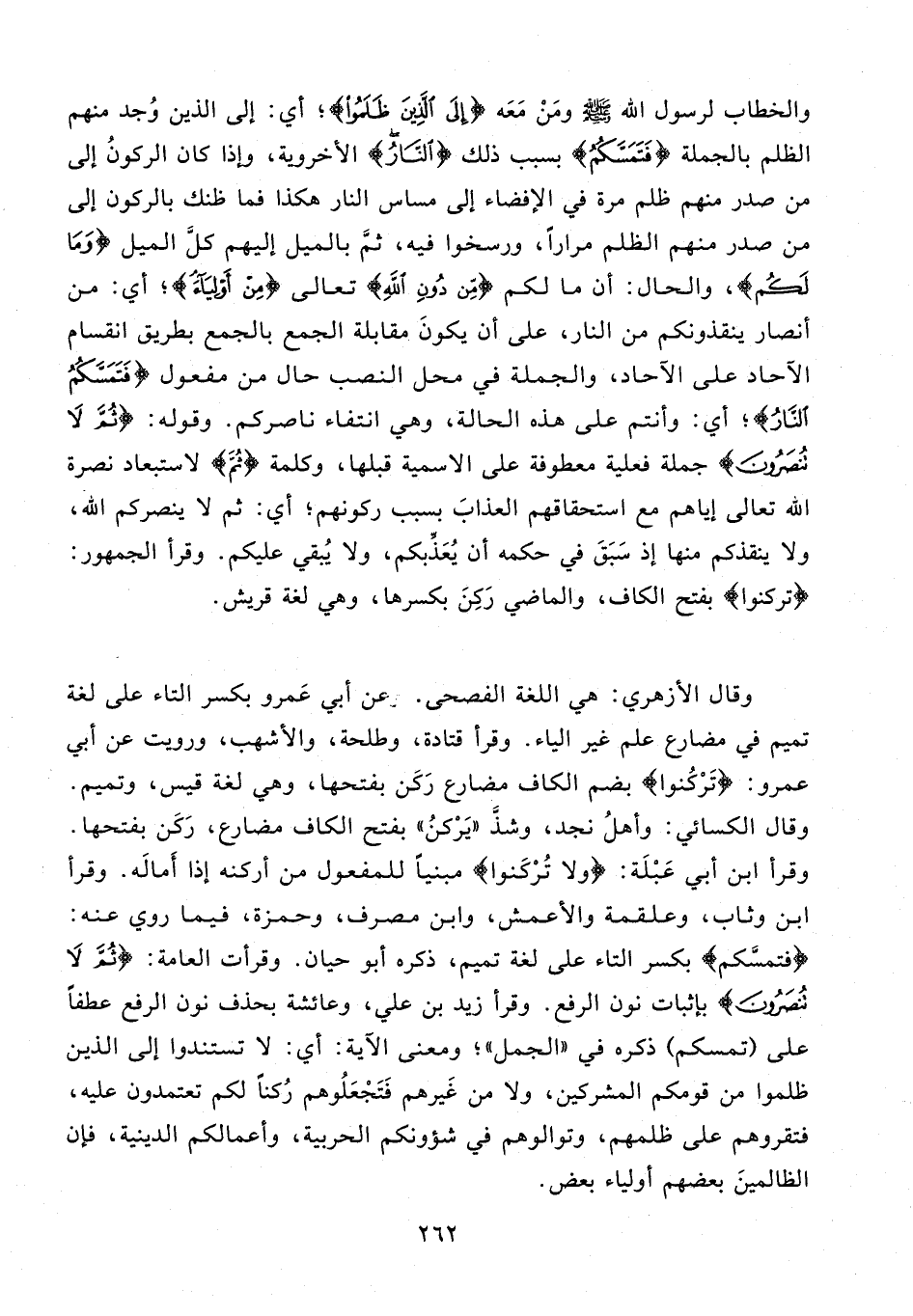 وقال الأزهري: هي اللغة الفصحى. وعن أبي عَمرو بكسر التاء على لغة تميم في مضارع علم غير الياء. وقرأ قتادة، وطلحة، والأشهب، ورويت عن أبي عمرو: {تَرْكُنوا} بضم الكاف مضارع رَكَن بفتحها، وهي لغة قيس، وتميم. وقال الكسائي: وأهلُ نجد، وشذَّ "يَرْكنُ" بفتح الكاف مضارع، رَكَن بفتحها. وقرأ ابن أبي عَبْلَة: {ولا تُرْكَنوا} مبنيًّا للمفعول من أركنه إذا أَمالَه. وقرأ ابن وثاب، وعلقمة والأعمش، وابن مصرف، وحمزة، فيما روي عنه: {فتمسَّكم} بكسر التاء على لغة تميم، ذكره أبو حيان. وقرأت العامة: {ثُمَّ لَا تُنْصَرُونَ} بإثبات نون الرفع. وقرأ زيد بن علي، وعائشة بحذف نون الرفع عطفًا على (تمسكم) ذكره في "الجمل"؛ ومعنى الآية: أي: لا تستندوا إلى الذين ظلموا من قومكم المشركين، ولا من غَيرهم فَتَجْعَلُوهم رُكنًا لكم تعتمدون عليه، فتقروهم على ظلمهم، وتوالوهم في شؤونكم الحربية، وأعمالكم الدينية، فإن الظالمينَ بعضهم أولياء بعض.