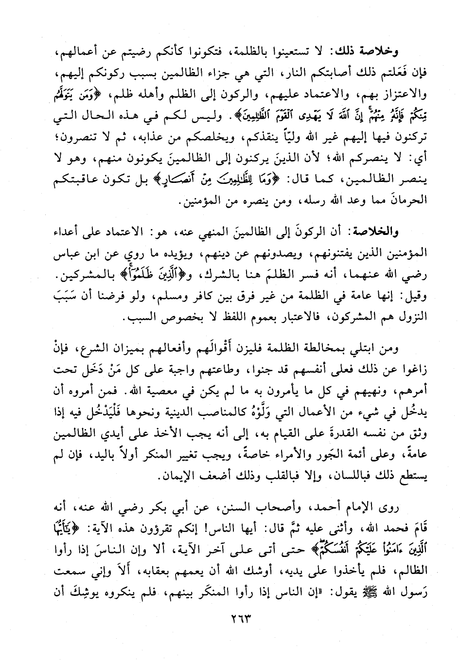 روى الإِمام أحمد، وأصحاب السنن, عن أبي بكر رضي الله عنه، أنه قَامَ فحمد الله، وأثنى عليه ثمَّ قال: أيها الناس! إنكم تقرؤون هذه الآية: {يَا أَيُّهَا الَّذِينَ آمَنُوا عَلَيْكُمْ أَنْفُسَكُمْ} حتى أتى على آخر الآية، ألا وإن الناسَ إذا رأوا الظالم، فلم يأخذوا على يديه، أوشك الله أن يعمهم بعقابه، أَلاَ وإني سمعت رَسول الله - صلى الله عليه وسلم - يقول: "إن الناس إذا رأوا المنكَر بينهم، فلم ينكروه يوشِكَ أن