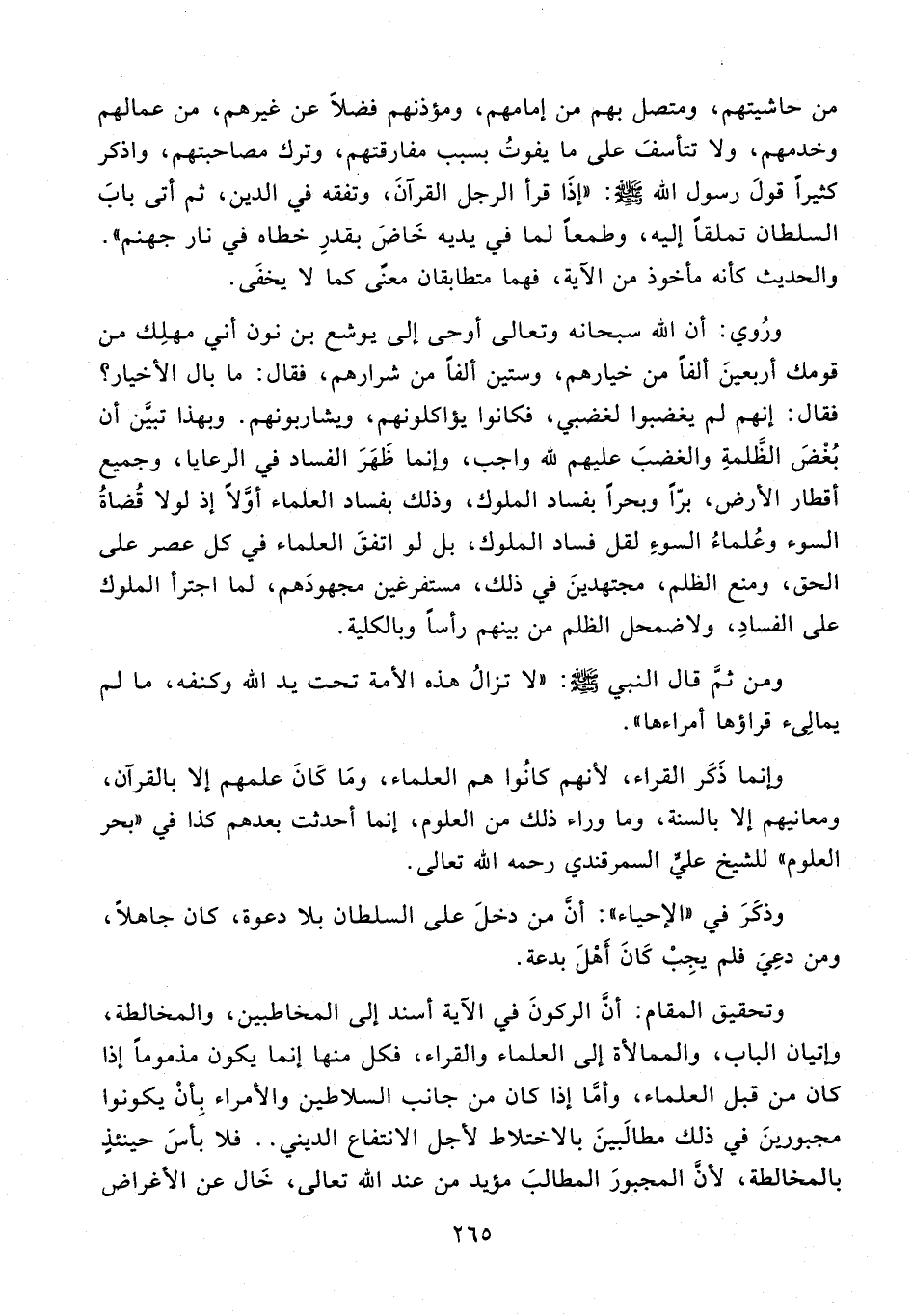 ورُوي: أن الله سبحانه وتعالى أوحى إلى يوشع بن نون أني مهلِك من قومك أربعينَ ألفًا من خيارهم، وستين ألفًا من شرارهم، فقال: ما بال الأخيار؟ فقال: إنهم لم يغضبوا لغضبي، فكانوا يؤاكلونهم، ويشاربونهم. وبهذا تبيَّن أن بُغْضَ الظَّلمةِ والغضبَ عليهم لله واجب، وإنما ظَهَرَ الفساد في الرعايا، وجميع أقطار الأرض، برًّا وبحرًا بفساد الملوك، وذلك بفساد العلماء أوَّلًا إذ لولا قُضاةُ السوء وعُلماءُ السوءِ لقل فساد الملوك، بل لو اتفقَ العلماء في كل عصر على الحق، ومنع الظلم، مجتهدينَ في ذلك، مستفرغين مجهودَهم، لما اجترأ الملوك على الفسادِ، ولاضمحل الظلم من بينهم رأسًا وبالكلية.