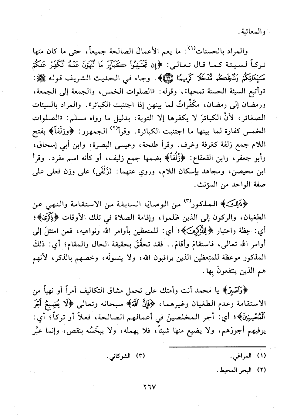 والمراد بالحسنات (¬1): ما يعم الأعمالَ الصالحة جميعًا، حتى ما كان منها تركًا لسيئة كما قال تعالى: {إِنْ تَجْتَنِبُوا كَبَائِرَ مَا تُنْهَوْنَ عَنْهُ نُكَفِّرْ عَنْكُمْ سَيِّئَاتِكُمْ وَنُدْخِلْكُمْ مُدْخَلًا كَرِيمًا (31)}. وجاء في الحديث الشريف قوله - صلى الله عليه وسلم -: "وأتبع السيئة الحسنة تمحها"، وقوله: "الصلوات الخمس، والجمعة إلى الجمعة، ورمضان إلى رمضان، مكَفِّراتٌ لما بينهن إذا اجتنبت الكبائر". والمراد بالسيئات الصغائر؛ لأنَّ الكبائرَ لا يكفرها إلا التوبة، بدليل ما رواه مسلم: "الصلوات الخمس كفارة لما بينها ما اجتنبت الكبائر". وقرأ (¬2) الجمهور: {وزلَفًا} بفتح اللام جمع زلفة كغرفة وغرف. وقرأ طلحة، وعيسى البصرة، وابن أبي إسحاق، وأبو جعفر، وابن القعقاع: {زُلُفًا} بضمها جمع زليف، أو كأنه اسم مفرد. وقرأ ابن محيصن، ومجاهد بإسكان اللام، وروي عنهما: (زَلْفَى) على وزن فعلى على صفة الواحد من المؤنث.