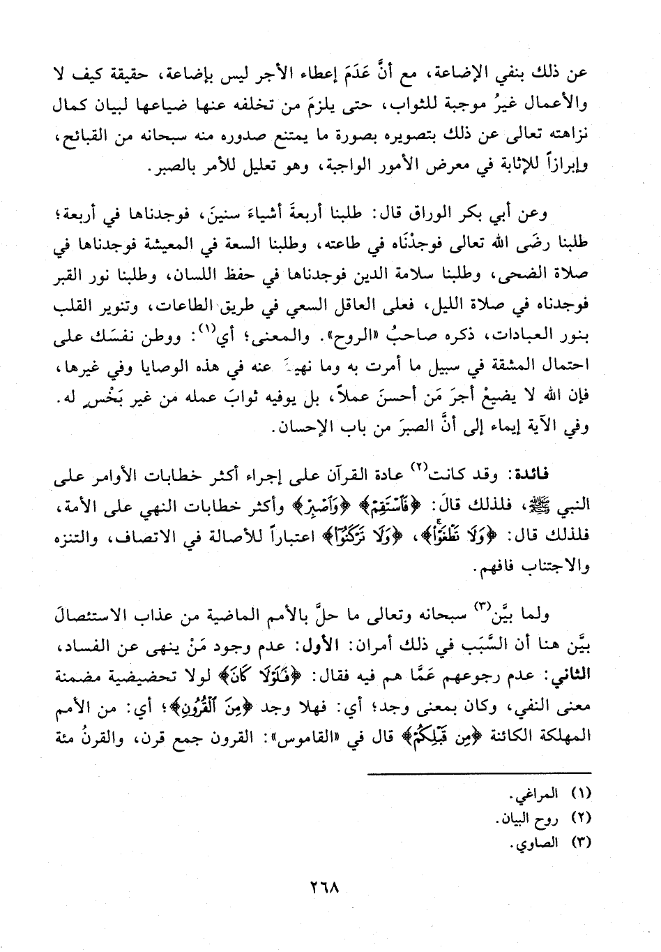 وعن أبي بكر الوراق قال: طلبنا أربعةَ أشياءَ سنينَ، فوجدناها في أربعة؛ طلبنا رضَى الله تعالى فوجدْنَاه في طاعته، وطلبنا السعة في المعيشة فوجدناها في صلاة الضحى، وطلبنا سلامة الدين فوجدناها في حفظ اللسان، وطلبنا نور القبر فوجدناه في صلاة الليل، فعلى العاقل السعي في طريق الطاعات، وتنوير القلب بنور العبادات، ذكره صاحبُ "الروح". والمعنى؛ أي (¬1): ووطن نفسَك على احتمال المشقة في سبيل ما أمرت به وما نهيتَ عنه في هذه الوصايا وفي غيرها، فإن الله لا يضيعْ أجرَ مَن أحسنَ عملًا، بل يوفيه ثوابَ عمله من غير بَخْسٍ له. وفي الآية إيماء إلى أنَّ الصبرَ من باب الإحسان.