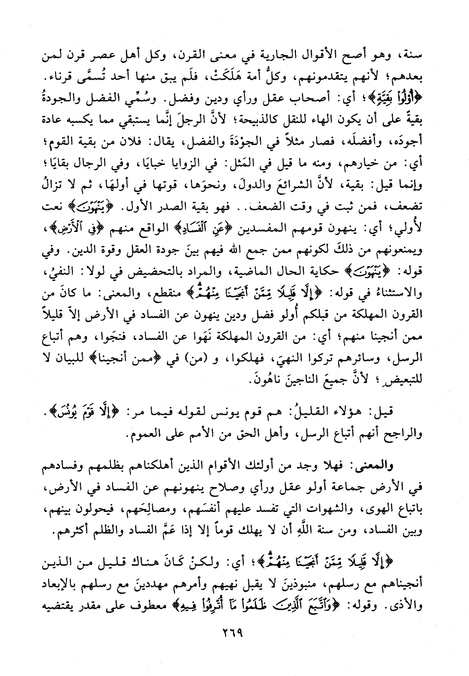 سنة، وهو أصح الأقوال الجارية في معنى القرن، وكل أهل عصر قرن لمن بعدهم؛ لأنهم يتقدمونهم، وكلُّ أمة هَلَكَتْ، فلَم يبق منها أحد تُسمَّى قرناء. {أُولُو بَقِيَّةٍ}؛ أي: أصحاب عقل ورأي ودين وفضل. وسُمِّي الفضل والجودةُ بقيةً على أن يكون الهاء للنقل كالذبيحة؛ لأنَّ الرجلَ إنَّما يستبقي مما يكسبه عادة أجودَه، وأفضلَه، فصار مثلًا في الجوْدَةَ والفضل، يقال: فلان من بقية القوم؛ أي: من خيارهم، ومنه ما قيل في المَثل: في الزوايا خبايَا، وفي الرجال بقايَا؛ وإنما قيل: بقية, لأنَّ الشرائعَ والدولَ، ونحوَها، قوتها في أولهَا، ثم لا تزالُ تضعف، فمن ثبت في وقت الضعف .. فهو بقية الصدر الأول. {يَنْهَوْنَ} نعت لأُولي؛ أي: ينهون قومهم المفسدين {عَنِ الْفَسَادِ} الواقع منهم {فِي الْأَرْضِ}، ويمنعونهم من ذلكَ لكونهم ممن جمع الله فيهم بينَ جودة العقل وقوة الدين. وفي قوله: {يَنْهَوْنَ} حكاية الحال الماضية، والمراد بالتحضيض في لولا: النفيُ، والاستثناءُ في قوله: {إِلَّا قَلِيلًا مِمَّنْ أَنْجَيْنَا مِنْهُمْ} منقطع، والمعنى: ما كانَ من القرون المهلكة من قبلكم أُولو فضل ودين ينهون عن الفساد في الأرض إلّا قليلًا ممن أنجينا منهم؛ أي: من القرون المهلكة نَهَوا عن الفساد، فنجَوا، وهم أتباع الرسل، وسائرهم تركوا النهيَ، فهلكوا، و (من) في {ممن أنجينا} للبيان لا للتبعيضِ؛ لأنَّ جميعَ الناجينَ ناهُونَ.
