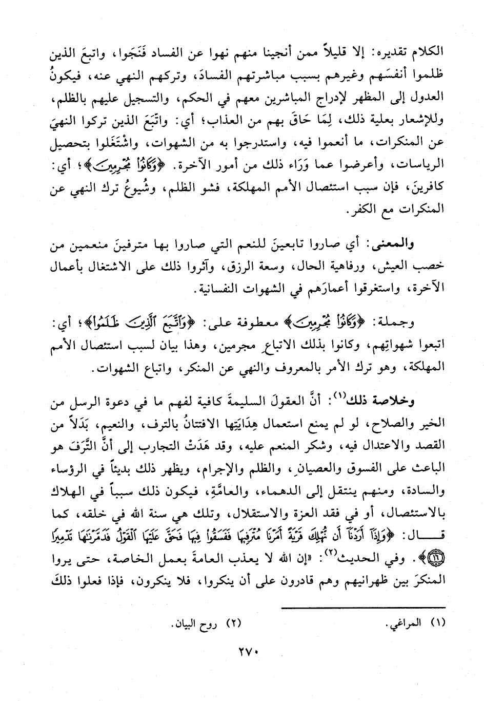 وخلاصة ذلك (¬1): أنَّ العقولَ السليمةَ كافية لفهم ما في دعوة الرسل من الخير والصلاح، لو لم يمنع استعمال هِدَايَتِها الافتتانُ بالترف، والنعيم، بَدَلًا من القصد والاعتدال فيه، وشكر المنعم عليه، وقد هَدَتْ التجارب إلى أنَّ التَّرَفَ هو الباعث على الفسوق والعصيانِ، والظلم والإجرام، ويظهر ذلك بديئًا في الرؤساء والسادة، ومنهم ينتقل إلى الدهماء، والعامَّةِ، فيكون ذلك سببًا في الهلاك بالاستئصال، أو في فقد العزة والاستقلال، وتلك هي سنة الله في خلقه، كما قال: {وَإِذَا أَرَدْنَا أَنْ نُهْلِكَ قَرْيَةً أَمَرْنَا مُتْرَفِيهَا فَفَسَقُوا فِيهَا فَحَقَّ عَلَيْهَا الْقَوْلُ فَدَمَّرْنَاهَا تَدْمِيرًا (16)}. وفي الحديث (¬2): "إن الله لا يعذب العامةَ بعمل الخاصة، حتى يروا المنكرَ بين ظهرانيهم وهم قادرون على أن ينكروا، فلا ينكرون، فإذا فعلوا ذلكَ