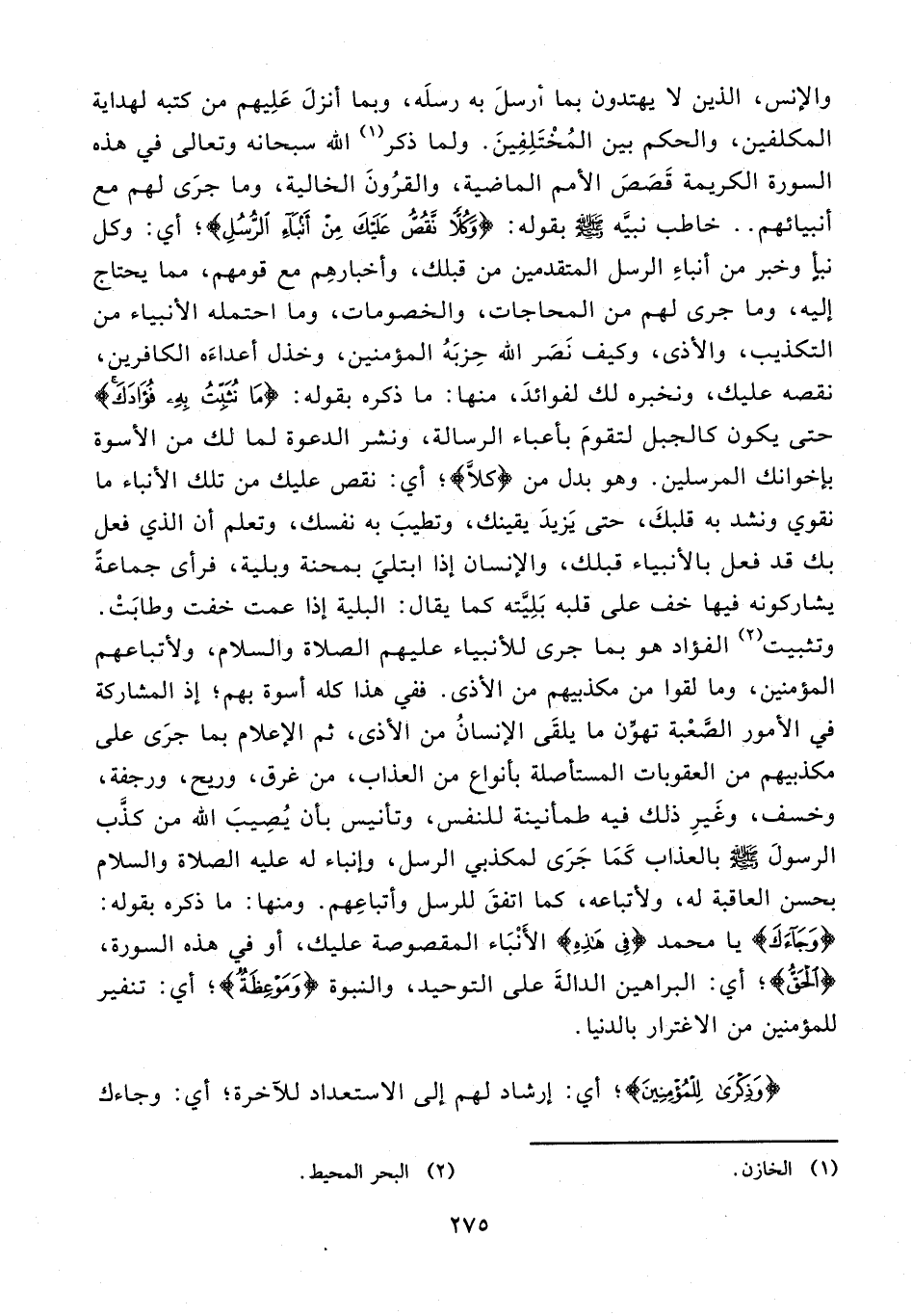 120 - ولما ذكر (¬1) الله سبحانه وتعالى في هذه السورة الكريمة قَصَصَ الأمم الماضية، والقرُونَ الخالية، وما جرَى لهم مع أنبيائهم .. خاطب نبيَّه - صلى الله عليه وسلم - بقوله: {وَكُلًّا نَقُصُّ عَلَيْكَ مِنْ أَنْبَاءِ الرُّسُلِ}؛ أي: وكل نبأٍ وخبر من أنباءِ الرسل المتقدمين من قبلك، وأخبارهِم مع قومهم، مما يحتاج إليه، وما جرى لهم من المحاجات، والخصومات، وما احتمله الأنبياء من التكذيب، والأذى، وكيف نَصَر الله حِزبَهُ المؤمنين، وخذل أعداءَه الكافرين، نقصه عليك، ونخبره لك لفوائدَ، منها: ما ذكره بقوله: {مَا نُثَبِّتُ بِهِ فُؤَادَكَ} حتى يكون كالجبل لتقومَ بأعباء الرسالة، ونشر الدعوة لما لك من الأسوة بإخوانك المرسلين. وهو بدل من {كلًّا}؛ أي: نقص عليك من تلك الأنباء ما نقوي ونشد به قلبكَ، حتى يَزيدَ يقينك، وتطيبَ به نفسك، وتعلم أن الذي فعل بك قد فعل بالأنبياء قبلك، والإنسان إذا ابتليَ بمحنة وبلية، فرأى جماعةً يشاركونه فيها خف على قلبه بَلِيَّته كما يقال: البلية إذا عمت خفت وطابَتْ. وتثبيت (¬2) الفؤاد هو بما جرى للأنبياء عليهم الصلاة والسلام، ولأتباعهم المؤمنين، وما لقوا من مكذبيهم من الأذى. ففي هذا كله أسوة بهم؛ إذ المشاركة في الأمور الصَّعْبة تهوِّن ما يلقَى الإنسانُ من الأذى، ثم الإعلام بما جرَى على مكذبيهم من العقوبات المستأصلة بأنواع من العذاب، من غرق، وريح، ورجفة، وخسف، وغَيرِ ذلك فيه طمأنينة للنفس، وتأنيس بأن يُصِيبَ الله من كذَّب الرسولَ - صلى الله عليه وسلم - بالعذاب كَمَا جَرَى لمكذبي الرسل، وإنباء له عليه الصلاة والسلام بحسن العاقبة له، ولأتباعه، كما اتفقَ للرسل وأتباعِهم. ومنها: ما ذكره بقوله: {وَجَاءَكَ} يا محمَّد {فِي هَذِهِ} الأَنْبَاء المقصوصة عليك، أو في هذه السورة، {الْحَقُّ}؛ أي: البراهين الدالةَ على التوحيد، والنبوة {وَمَوْعِظَةٌ}؛ أي: تنفير للمؤمنين من الاغترار بالدنيا.