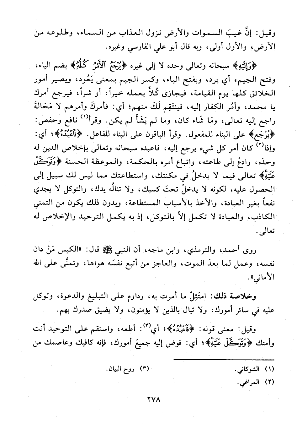 {وَإِلَيْهِ} سبحانه وتعالى وحده لا إلى غيره {يُرْجَعُ الْأَمْرُ كُلُّهُ} بضم الياء، وفتح الجيم، أي يرد، وبفتح الياء، وكسر الجيم بمعنى يَعُود، ويصير أمور الخلائق كلها يوم القيامة، فيجازى كُلًّا بعمله خيرًا، أو شرًّا، فيرجع أمرك يا محمَّد، وأمُر الكفار إليه، فينتَقِم لَكَ منهم؛ أي: فأمركَ وأمرهم لا مَحَالةَ راجع إليه تعالى، ومَا شَاء كان، وما لم يَشَأْ لم يكن. وقرأ (¬1) نافع وحفص: {يُرْجَعُ} على البناء للمفعول. وقرأ الباقون على البناء للفاعل. {فَاعْبُدْهُ}؛ أي: وإذا (¬2) كان أمر كل شيء يرجع إليه، فاعبده سبحانه وتعالى بإخلاص الدين له وحدَه، وادعُ إلى طاعته، واتباع أمره بالحكمة، والموعظة الحسنة {وَتَوَكَّلْ عَلَيْهِ} تعالى فيما لا يدخلُ في مكنتك، واستطاعتك مما ليس لك سبيل إلى الحصول عليه، لكونه لا يدخلُ تحتَ كسبك، ولا تنالُه يدك، والتوكل لا يجدي نفعًا بغير العبادة، والأخذ بالأسباب المستطاعة، وبدون ذلك يكون من التمني الكاذب، والعبادة لا تكمل إلّا بالتوكل، إذ به يكمل التوحيد والإخلاص له تعالى.