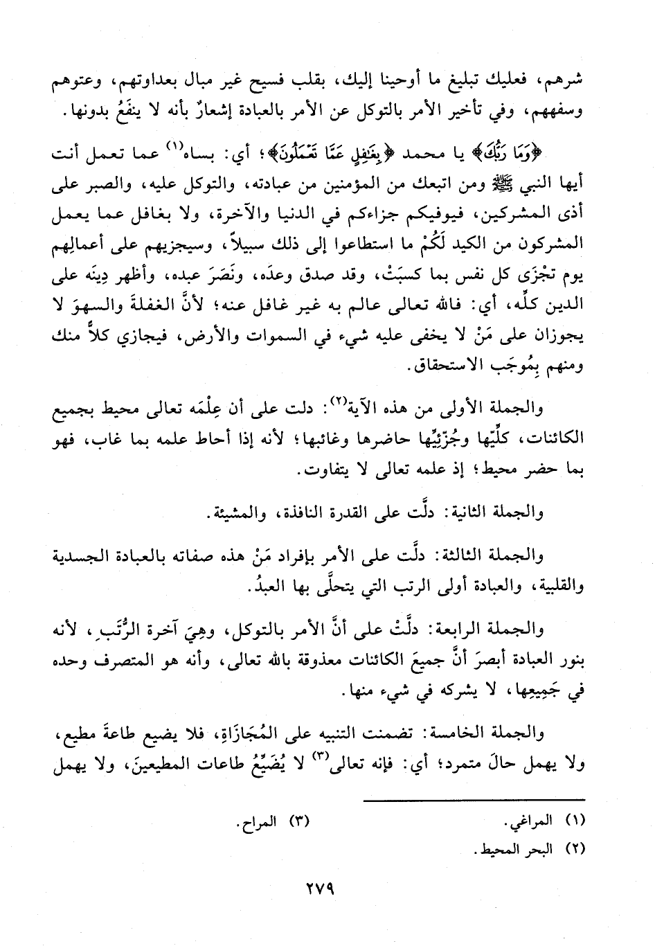 شرهم، فعليك تبليغ ما أوحينا إليك، بقلب فسيح غير مبال بعداوتهم، وعتوهم وسفههم، وفي تأخير الأمر بالتوكل عن الأمر بالعبادة إشعارٌ بأنه لا ينفَعُ بدونها.
