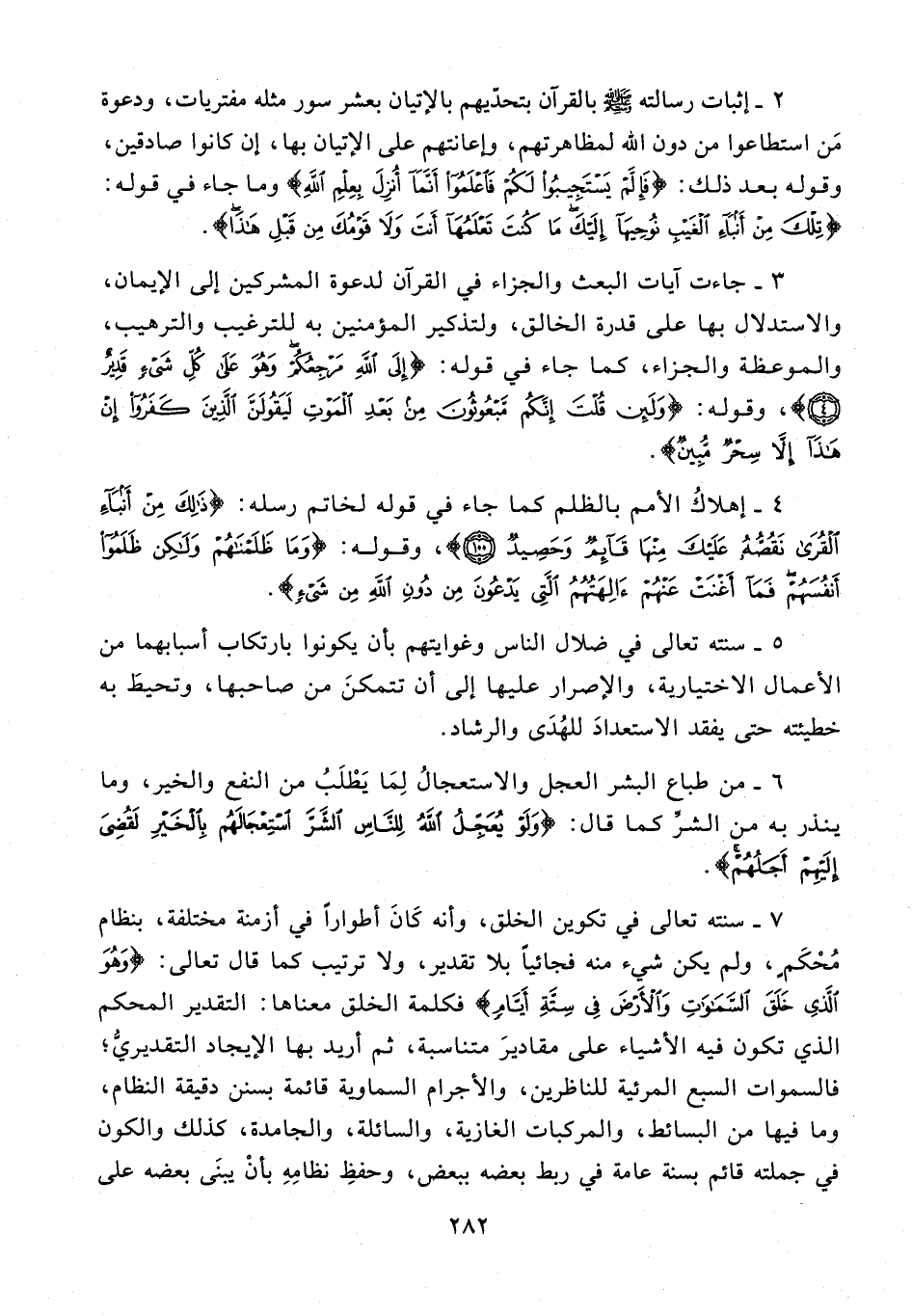 7 - سنته تعالى في تكوين الخلق، وأنه كَانَ أطوارًا في أزمنة مختلفة، بنظام مُحْكَمٍ، ولم يكن شيء منه فجائيًّا بلا تقدير، ولا ترتيب كما قال تعالى: {وَهُوَ الَّذِي خَلَقَ السَّمَاوَاتِ وَالْأَرْضَ فِي سِتَّةِ أَيَّامٍ} فكلمة الخلق معناها: التقدير المحكم الذي تكون فيه الأشياء على مقاديرَ متناسبة، ثم أريد بها الإيجاد التقديريُّ؛ فالسموات السبع المرئية للناظرين، والأجرام السماوية قائمة بسنن دقيقة النظام، وما فيها من البسائط، والمركبات الغازية، والسائلة، والجامدة، كذلك والكون في جملته قائم بسنة عامة في ربط بعضه ببعض، وحفظِ نظامِهِ بأنْ يبنَى بعضه على
