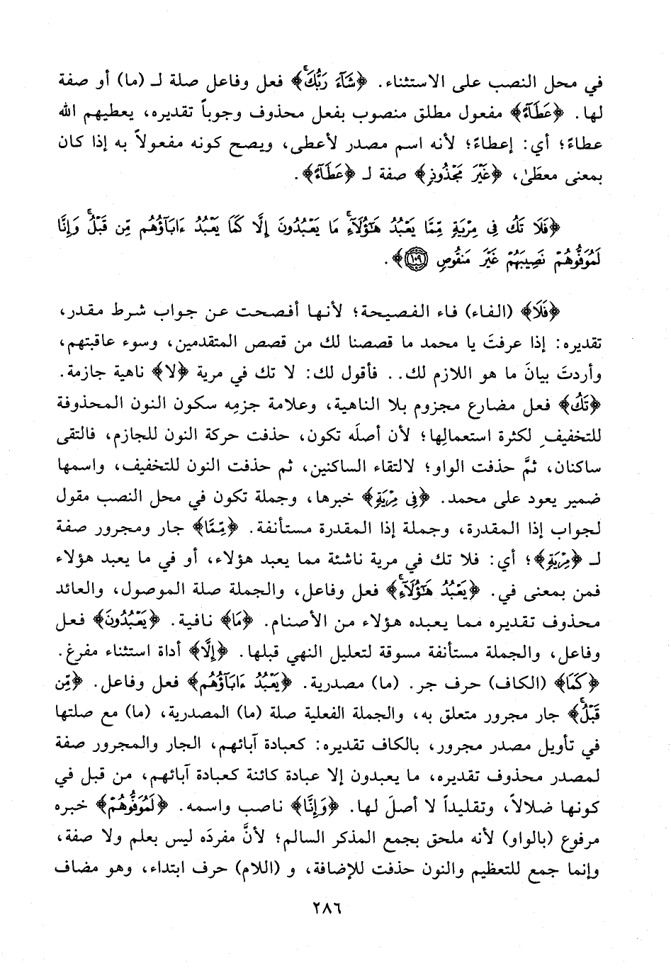 {فَلَا} (الفاء) فاء الفصيحة؛ لأنها أفصحت عن جواب شرط مقدر، تقديره: إذا عرفتَ يا محمَّد ما قصصنا لك من قصص المتقدمين، وسوء عاقبتهم، وأردتَ بيانَ ما هو اللازم لك .. فأقول لك: لا تك في مرية {لا} ناهية جازمة. {تَكُ} فعل مضارع مجزوم بلا الناهية، وعلامة جزمِه سكون النون المحذوفة للتخفيفِ لكثرة استعمالِها؛ لأن أصلَه تكون، حذفت حركة النون للجازم، فالتقى ساكنان، ثمَّ حذفت الواو؛ لالتقاء الساكنين، ثم حذفت النون للتخفيف، واسمها ضمير يعود على محمَّد. {فِي مِرْيَةٍ} خبرها، وجملة تكون في محل النصب مقول لجواب إذا المقدرة، وجملة إذا المقدرة مستأنفة. {مِمَّا} جار ومجرور صفة لـ {مِرْيَةٍ}؛ أي: فلا تك في مرية ناشئة مما يعبد هؤلاء، أو في ما يعبد هؤلاء فمن بمعنى في. {يَعْبُدُ هَؤُلَاءِ} فعل وفاعل، والجملة صلة الموصول، والعائد محذوف تقديره مما يعبده هؤلاء من الأصنام. {مَا} نافية. {يَعْبُدُونَ} فعل وفاعل، والجملة مستأنفة مسوقة لتعليل النهي قبلها. {إِلَّا} أداة استثناء مفرغ. {كَمَا} (الكاف) حرف جر. (ما) مصدرية. {يَعْبُدُ آبَاؤُهُمْ} فعل وفاعل. {مِنْ قَبْلُ} جار مجرور متعلق به، والجملة الفعلية صلة (ما) المصدرية، (ما) مع صلتها في تأويل مصدر مجرور، بالكاف تقديره: كعبادة آبائهم، الجار والمجرور صفة لمصدر محذوف تقديره، ما يعبدون إلا عبادة كائنة كعبادة آبائهم، من قبل في كونها ضلالًا، وتقليدًا لا أصلَ لها. {وَإِنَّا} ناصب واسمه. {لَمُوَفُّوهُمْ} خبره مرفوع (بالواو) لأنه ملحق بجمع المذكر السالم؛ لأنَّ مفردَه ليس بعلم ولا صفة، وإنما جمع للتعظيم والنون حذفت للإضافة، و (اللام) حرف ابتداء، وهو مضاف