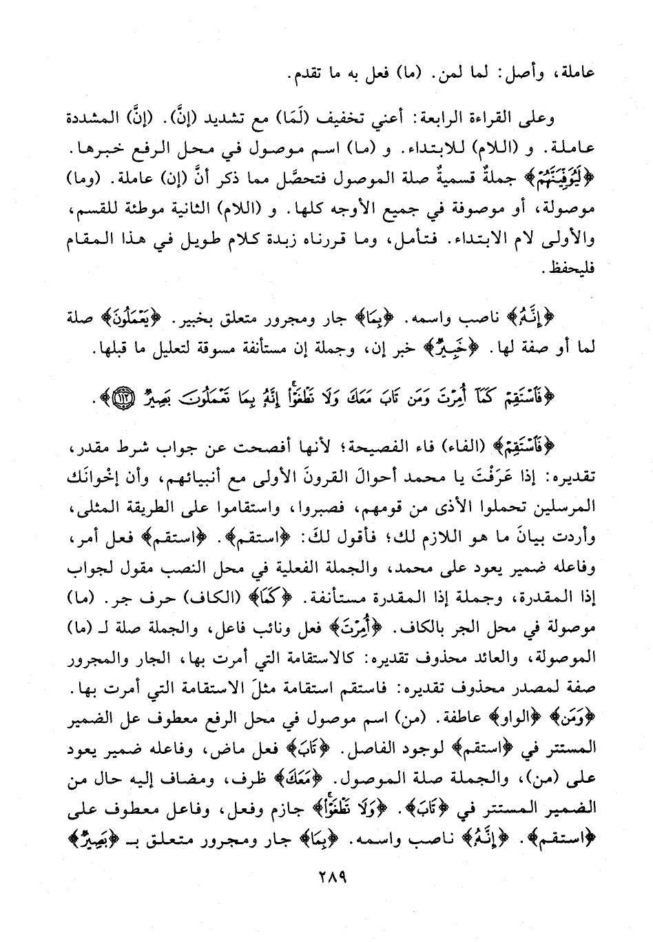 {فَاسْتَقِمْ} (الفاء) فاء الفصيحة؛ لأنها أفصحت عن جواب شرط مقدر، تقديره: إذا عَرَفْتَ يا محمَّد أحوالَ القرونَ الأولى مع أنبيائهم، وأن إخْوانَك المرسلين تحملوا الأذى من قومهم، فصبروا، واستقاموا على الطريقة المثلى، وأردت بيانَ ما هو اللازم لك؛ فأقول لكَ: {استقم}. {استقم} فعل أمر، وفاعله ضمير يعود على محمد، والجملة الفعلية في محل النصب مقول لجواب إذا المقدرة، وجملة إذا المقدرة مستأنفة. {كَمَا} (الكاف) حرف جر. (ما) موصولة في محل الجر بالكاف. {أُمِرْتَ} فعل ونائب فاعل، والجملة صلة لـ (ما) الموصولة، والعائد محذوف تقديره: كالاستقامة التي أمرت بها، الجار والمجرور صفة لمصدر محذوف تقديره: فاستقم استقامة مثلَ الاستقامة التي أمرت بها. {وَمَنْ} {الواو} عاطفة. (من) اسم موصول في محل الرفع معطوف عل الضمير المستتر في {استقم} لوجود الفاصل. {تَابَ} فعل ماض، وفاعله ضمير يعود على (من)، والجملة صلة الموصول. {مَعَكَ} ظرف، ومضاف إليه حال من الضمير المستتر في {تَابَ}. {وَلَا تَطْغَوْا} جازم وفعل، وفاعل معطوف على {استقم}. {إِنَّهُ} ناصب واسمه. {بِمَا} جار ومجرور متعلق بـ {بَصِيرٌ}