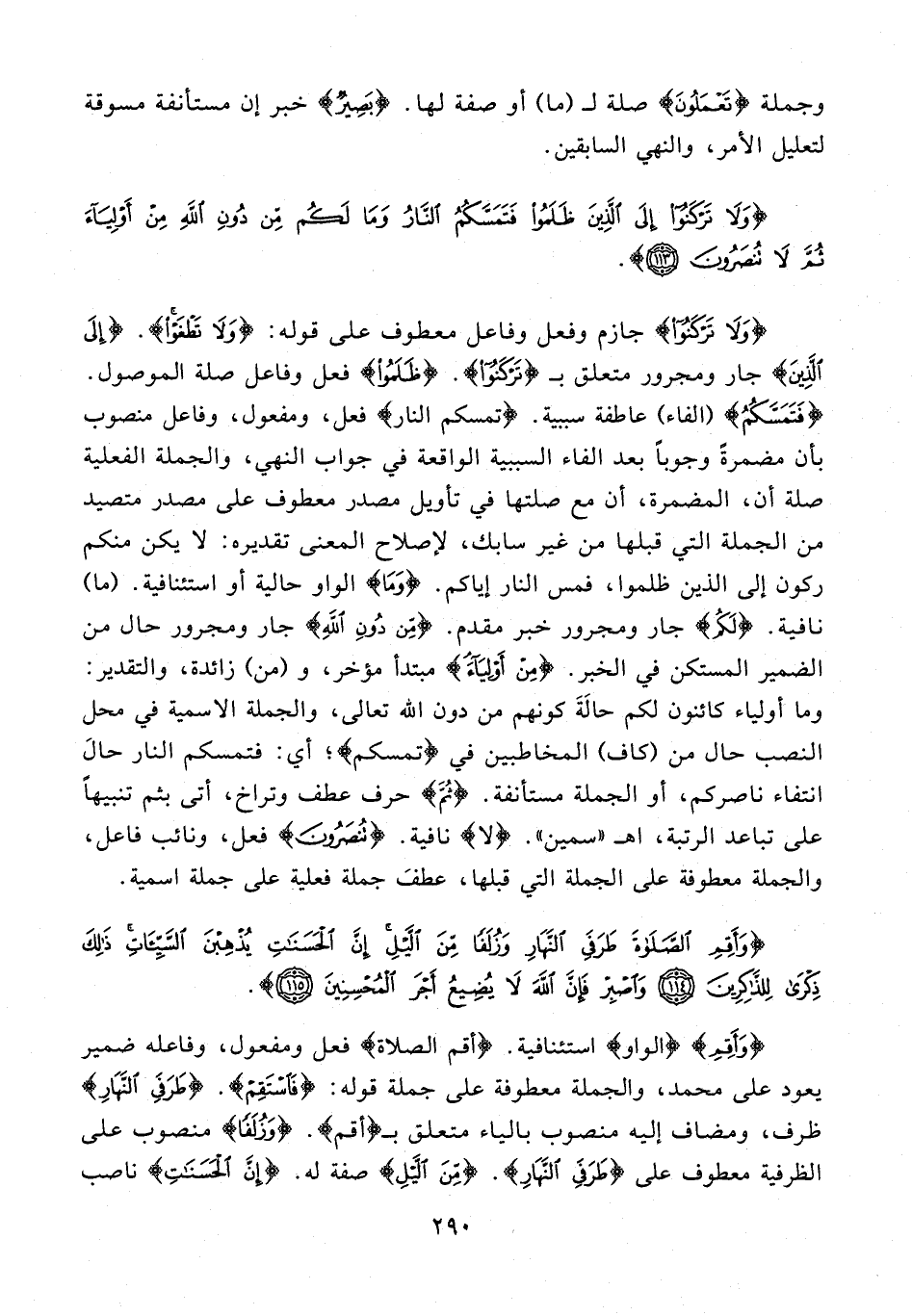 {وَلَا تَرْكَنُوا} جازم وفعل وفاعل معطوف على قوله: {وَلَا تَطْغَوْا}. {إِلَى الَّذِينَ} جار ومجرور متعلق بـ {تَرْكَنُوا}. {ظَلَمُوا} فعل وفاعل صلة الموصول. {فَتَمَسَّكُمُ} (الفاء) عاطفة سببية. {تمسكم النار} فعل، ومفعول، وفاعل منصوب بأن مضمرةً وجوبًا بعد الفاء السببية الواقعة في جواب النهي، والجملة الفعلية صلة أن، المضمرة، أن مع صلتها في تأويل مصدر معطوف على مصدر متصيد من الجملة التي قبلها من غير سابك، لإصلاح المعنى تقديره: لا يكن منكم ركون إلى الذين ظلموا، فمس النار إياكم. {وَمَا} الواو حالية أو استئنافية. (ما) نافية. {لَكُمْ} جار ومجرور خبر مقدم. {مِن دُونِ اَللهِ} جار ومجرور حال من الضمير المستكن في الخبر. {مِنْ أَوْلِيَاءَ} مبتدأ مؤخر، و (من) زائدة، والتقدير: وما أولياء كائنون لكم حالَةَ كونهم من دون الله تعالى، والجملة الاسمية في محل النصب حال من (كاف) المخاطبين في {تمسكم}؛ أي: فتمسكم النار حالَ انتفاء ناصركم، أو الجملة مستأنفة. {ثُمَّ} حرف عطف وتراخ، أتى بثم تنبيهًا على تباعد الرتبة، اهـ "سمين". {لا} نافية. {تُنْصَرُونَ} فعل، ونائب فاعل، والجملة معطوفة على الجملة التي قبلها، عطفَ جملة فعلية على جملة اسمية.
