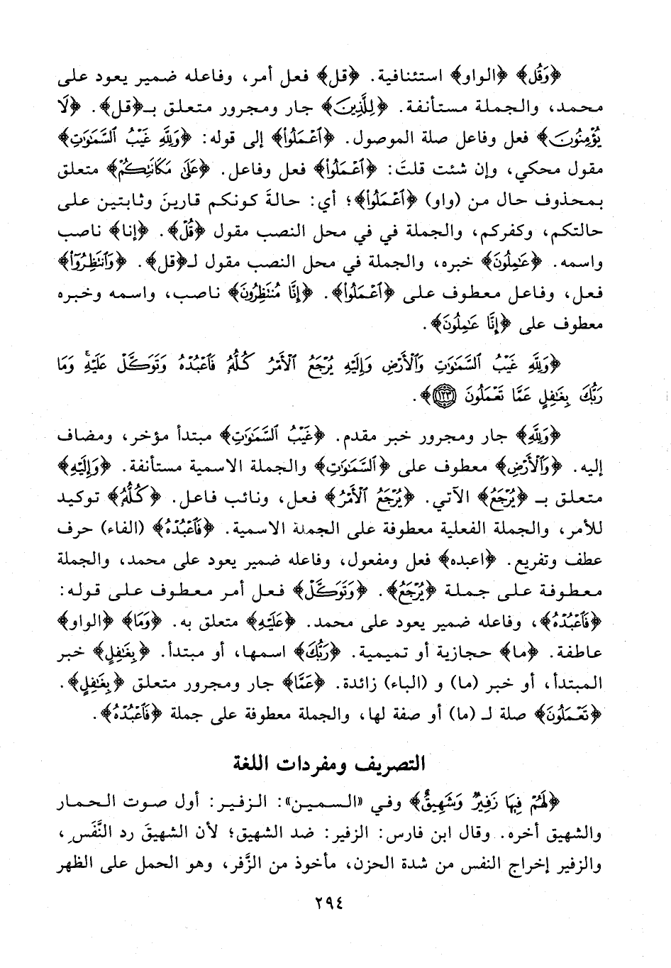 {وَلِلَّهِ} جار ومجرور خبر مقدم. {غَيْبُ السَّمَاوَاتِ} مبتدأ مؤخر، ومضاف إليه. {وَالْأَرْضِ} معطوف على {السَّمَاوَاتِ} والجملة الاسمية مستأنفة. {وَإِلَيْهِ} متعلق بـ {يُرْجَعُ} الآتي. {يُرْجَعُ الْأَمْرُ} فعل، ونائب فاعل. {كُلُّهُ} توكيد للأمر، والجملة الفعلية معطوفة على الجملة الاسمية. {فَاعْبُدْهُ} (الفاء) حرف عطف وتفريع. {اعبده} فعل ومفعول، وفاعله ضمير يعود على محمَّد، والجملة معطوفة على جملة {يُرْجَعُ}. {وَتَوَكَّلْ} فعل أمر معطوف على قوله: {فَاعْبُدْهُ}، وفاعله ضمير يعود على محمَّد. {عَلَيْهِ} متعلق به. {وَمَا} {الواو} عاطفة. {ما} حجازية أو تميمية. {رَبُّكَ} اسمها، أو مبتدأ. {بِغَافِلٍ} خبر المبتدأ، أو خبر (ما) و (الباء) زائدة. {عَمَّا} جار ومجرور متعلق {بِغَافِلٍ}. {تَعْمَلُونَ} صلة لـ (ما) أو صفة لها، والجملة معطوفة على جملة {فَاعْبُدْهُ}.
