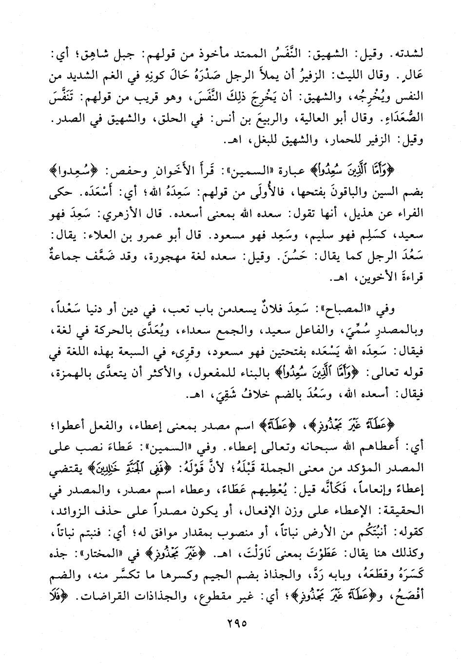 {وَأَمَّا الَّذِينَ سُعِدُوا} عبارة "السمين": قَرأَ الأَخَوانِ وحفص: {سُعِدوا} بضم السين والباقونَ بفتحها، فالأُولَى من قولهم: سَعِدَهُ الله؛ أي: أَسْعَدَه. حكى الفراء عن هذيل، أنها تقول: سعده الله بمعنى أسعده. قال الأزهري: سَعِدَ فهو سعيد، كسَلِم فهو سليم، وسَعِد فهو مسعود. قال أبو عمرو بن العلاء: يقال: سَعُدَ الرجل كما يقال: حَسُنَ. وقيل: سعده لغة مهجورة، وقد ضَعَّف جماعةٌ قراءةَ الأخوين، اهـ.
