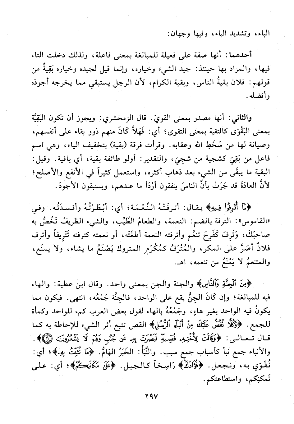 والثاني: أنها مصدر بمعنى القويّ. قال الزمخشري: ويجوز أن تكون البَقِيَّة بمعنى البَقْوَى كالتقية بمعنى التقوى؛ أي: فَهَلَّا كَانَ منهم ذوو بقاء على أنفسهم، وصيانة لها من سَخَطِ الله وعقابه. وقرأت فرقة (بقية) بتخفيف الياء، وهي اسم فاعل من بَقِيَ كشجية من شجِيَ، والتقدير: أولو طائفة بقية، أي باقية. وقيل: البقية ما يبقَى من الشيء بعد ذهاب أكثره، واستعمل كثيرًا في الأنفع والأصلح؛ لأنَّ العادَةَ قد جَرَتْ بأنَّ الناسَ ينفقون أرْدَأ ما عندهم، ويستبقون الأجودَ.