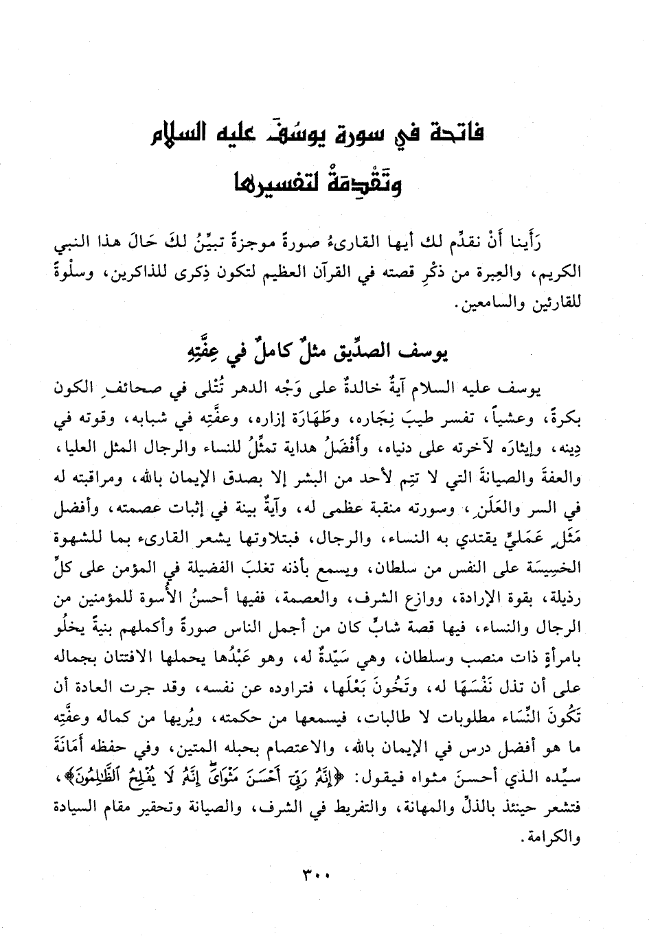 يوسف عليه السلام آيةٌ خالدةٌ على وَجْه الدهر تُتْلى في صحائفِ الكون بكرةً، وعشيًّا، تفسر طيبَ نِجَاره، وطَهَارَة إزاره، وعفَّتِه في شبابه، وقوته في دِينه، وإيثارَه لآخرته على دنياه، وأفْضَلُ هداية تمثِّلُ للنساء والرجال المثل العليا، والعفةَ والصيانةَ التي لا تتِم لأحد من البشر إلا بصدق الإيمان بالله، ومراقبته له في السر والعَلَنِ، وسورته منقبة عظمى له، وآيةٌ بينة في إثبات عصمته، وأفضل مَثَلٍ عَمَليٍّ يقتدي به النساء، والرجال، فبتلاوتها يشعر القارئ بما للشهوة الخسِيسَة على النفس من سلطان، ويسمع بأذنه تغلبَ الفضيلة في المؤمن على كلِّ رذيلة، بقوة الإرادة، ووازع الشرف، والعصمة، ففيها أحسنُ الأُسوة للمؤمنين من الرجال والنساء، فيها قصة شابٍّ كان من أجمل الناس صورةً وأكملهم بنيةً يخلُو بامرأةٍ ذات منصب وسلطان، وهي سَيّدةٌ له، وهو عَبْدُها يحملها الافتتان بجماله على أن تذل نَفْسَهَا له، وتَخُونَ بَعْلَها، فتراوده عن نفسه، وقد جرت العادة أن تَكُونَ النِّسَاء مطلوبات لا طالبات، فيسمعها من حكمته، ويُريها من كماله وعفَّتِه ما هو أفضل درس في الإيمان بالله، والاعتصام بحبله المتين، وفي حفظه أَمَانَةَ سيِّده الذي أحسنَ مثواه فيقول: {إِنَّهُ رَبِّي أَحْسَنَ مَثْوَايَ إِنَّهُ لَا يُفْلِحُ الظَّالِمُونَ}، فتشعر حينئذ بالذلِّ والمهانة، والتفريط في الشرف، والصيانة وتحقير مقام السيادة والكرامة.