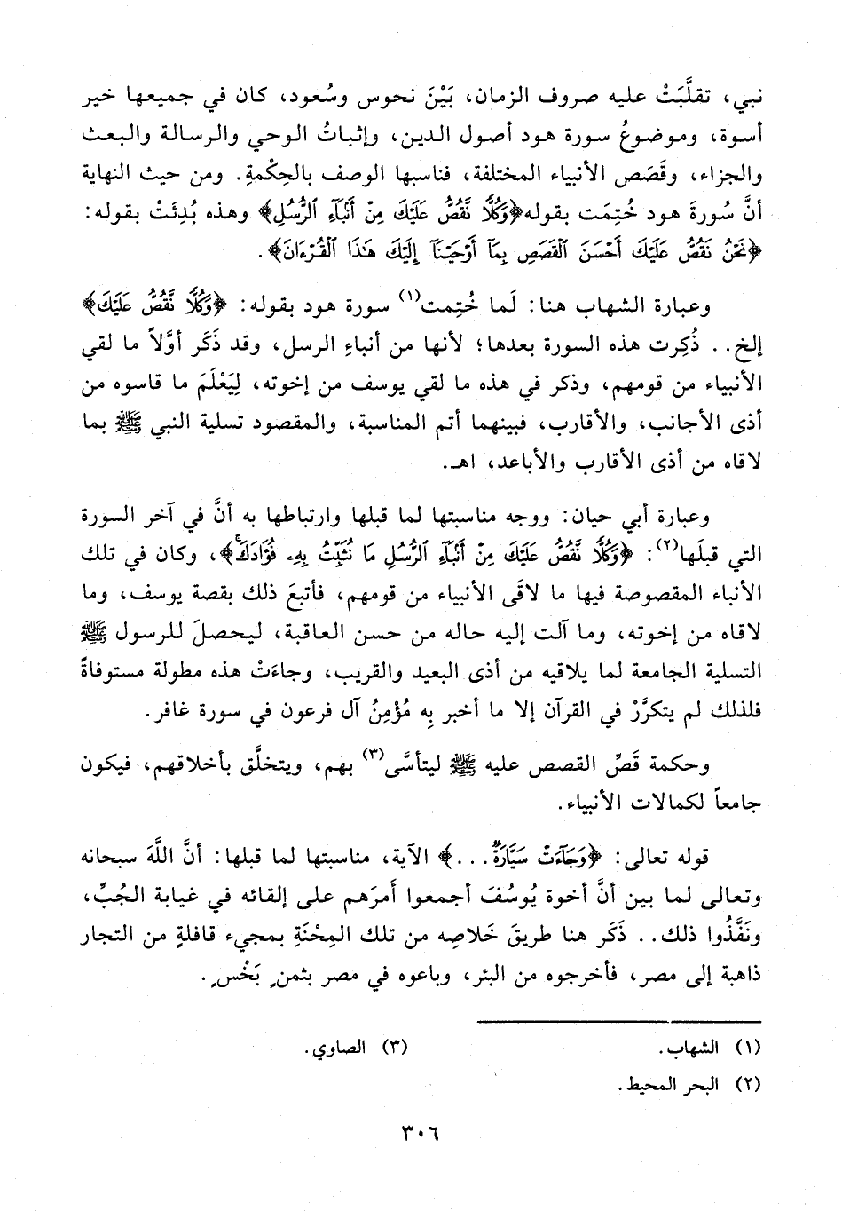 وعبارة أبي حيان: ووجه مناسبتها لما قبلها وارتباطها به أنَّ في آخر السورة التي قبلَها (¬2): {وَكُلًّا نَقُصُّ عَلَيْكَ مِنْ أَنْبَاءِ الرُّسُلِ مَا نُثَبِّتُ بِهِ فُؤَادَكَ}، وكان في تلك الأنباء المقصوصة فيها ما لاقَى الأنبياء من قومهم، فأتبعَ ذلك بقصة يوسف، وما لاقاه من إخوته، وما آلت إليه حاله من حسن العاقبة، ليحصلَ للرسول - صلى الله عليه وسلم - التسلية الجامعة لما يلاقيه من أذى البعيد والقريب، وجاءَتْ هذه مطولة مستوفاةً فلذلك لم يتكرَّرْ في القرآن إلا ما أخبر بِه مُؤْمِنُ آل فرعون في سورة غافر.