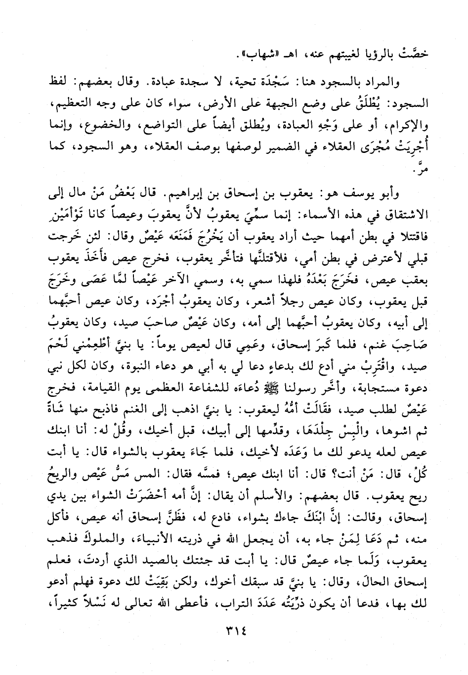 وأبو يوسف هو: يعقوب بن إسحاق بن إبراهيم. قال بَعْضُ مَنْ مال إلى الاشتقاق في هذه الأسماء: إنما سمِّيَ يعقوبُ لأنَّ يعقوبَ وعيصًا كانا تَوْأمَيْنِ فاقتتلا في بطن أمهما حيث أراد يعقوب أن يَخْرُجَ فَمَنَعَه عَيْصٌ وقال: لئن خَرجت قبلي لأعترض في بطن أمي، فلأقتلنَّها فتأخَّر يعقوب، فخرج عيص فأَخَذَ يعقوب بعقب عيص، فخَرَجَ بَعْدَهُ فلهذا سمي به، وسمي الآخر عَيْصًا لمَّا عَصَى وخَرَجَ قبل يعقوب، وكان عيص رجلًا أشعر، وكان يعقوبُ أجْرَد، وكان عيص أحبَّهما إلى أبيه، وكان يعقوبُ أحبَّهما إلى أمه، وكان عَيْصٌ صاحبَ صيد، وكان يعقوبُ صَاحِبَ غنم، فلما كَبرَ إسحاق، وعَمِي قال لعيص يومًا: يا بنيَّ أطْعِمْني لَحْمَ صيد، واقْتَرِبْ مني أدع لك بدعاءٍ دعا لي به أبي هو دعاء النبوة، وكان لكل نبي دعوة مستجابة، وأخَّر رسولنا - صلى الله عليه وسلم - دُعاءَه للشفاعة العظمى يوم القيامة، فخرج عَيْصٌ لطلب صيد، فقَالَتْ أمُّهُ ليعقوب: يا بنيَّ اذهب إلى الغنم فاذبح منها شَاةً ثم اشوها، والْبِسْ جِلْدَهَا، وقدِّمها إلى أبيك، قبل أخيك، وقُلْ له: أنا ابنك عيص لعله يدعو لك ما وَعَدَه لأخيك، فلما جَاءَ يعقوب بالشواء قال: يا أبت كُلْ، قال: مَنْ أنت؟ قال: أنا ابنك عيص؛ فمسَّه فقال: المس مَسُّ عَيْص والريحُ ريح يعقوب. قال بعضهم: والأسلم أن يقال: إنَّ أمه أحْضَرَتْ الشواء بين يدي إسحاق، وقالت: إنَّ ابْنَكَ جاءك بشواء، فادع له، فظَنَّ إسحاق أنه عيص، فأكل منه، ثم دَعَا لِمَنْ جاء به، أن يجعل الله في ذريته الأنبياءَ، والملوكَ فذهب يعقوب، وَلَمّا جاء عيصٌ قال: يا أبت قد جئتك بالصيد الذي أردتَ، فعلم إسحاق الحالَ، وقال: يا بنيَّ قد سبقك أخوك، ولكن بَقِيَتْ لك دعوة فهلم أدعو لك بها، فدعا أن يكون ذرِّيتُه عَدَدَ التراب، فأعطى الله تعالى له نَسْلًا كثيرًا،