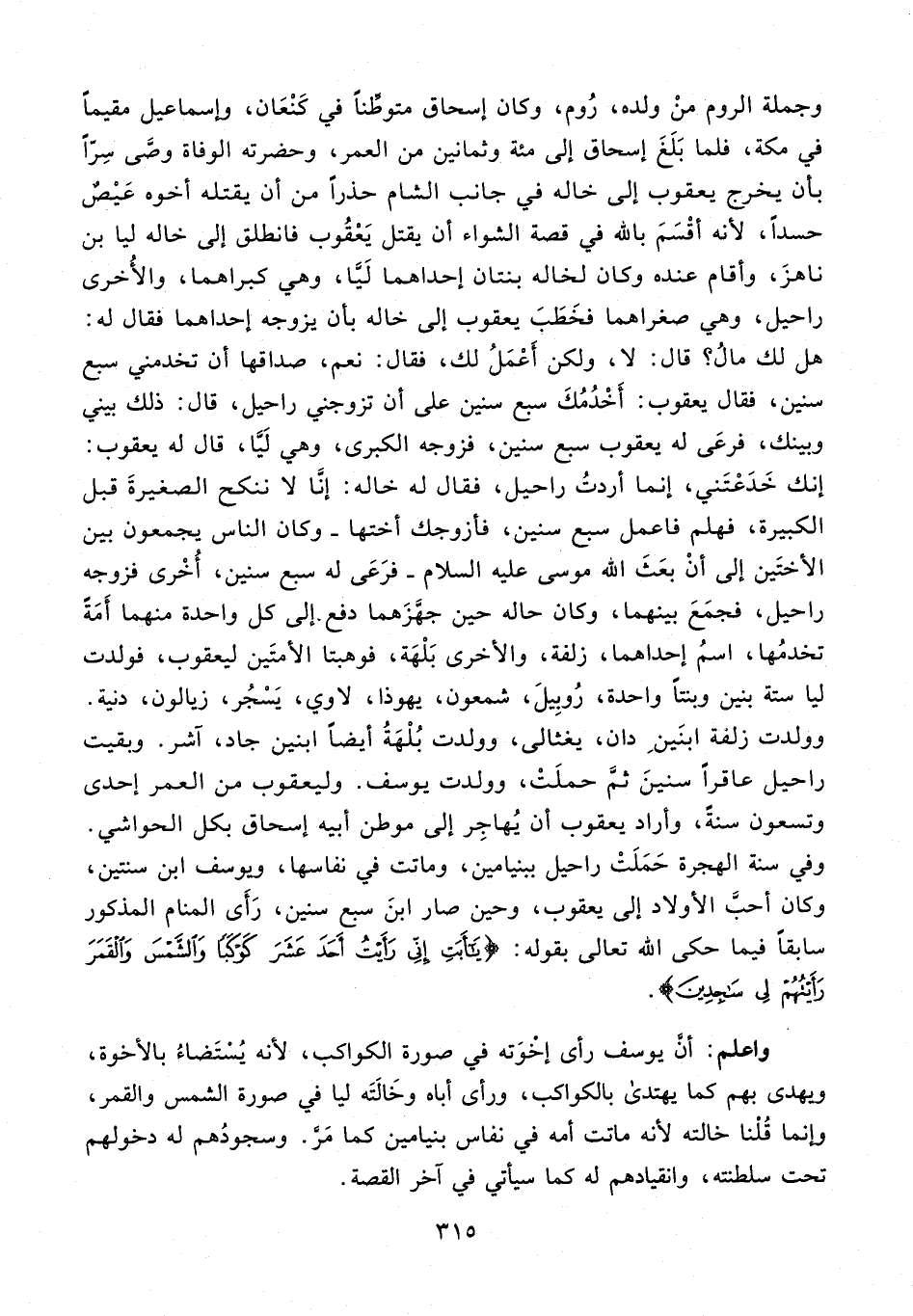 وجملة الروم منْ ولده، رُوم، وكان إسحاق متوطِّنًا في كَنْعَان، وإسماعيل مقيمًا في مكة، فلما بَلَغَ إسحاق إلى مئة وثمانين من العمر، وحضرته الوفاة وصَّى سِرًّا بأن يخرج يعقوب إلى خاله في جانب الشام حذرًا من أن يقتله أخوه عَيْصٌ حسدًا, لأنه أقْسَمَ بالله في قصة الشواء أن يقتل يَعْقُوب فانطلق إلى خاله ليا بن ناهزَ، وأقام عنده وكان لخاله بنتان إحداهما لَيَّا، وهي كبراهما، والأُخرى راحيل، وهي صغراهما فخَطَبَ يعقوب إلى خاله بأن يزوجه إحداهما فقال له: هل لك مالُ؟ قال: لا, ولكن أَعْمَلُ لك، فقال: نعم، صداقها أن تخدمني سبع سنين، فقال يعقوب: أَخْدُمُكَ سبع سنين على أن تزوجني راحيل، قال: ذلك بيني وبينك، فرعَى له يعقوب سبع سنين، فزوجه الكبرى, وهي لَيَّا، قال له يعقوب: إنك خَدَعْتَني، إنما أردتُ راحيل، فقال له خاله: إنَّا لا ننكح الصغيرةَ قبل الكبيرة، فهلم فاعمل سبع سنين، فأزوجك أختها - وكان الناس يجمعون بين الأختَين إلى أنْ بعَثَ الله موسى عليه السلام - فرَعَى له سبع سنين، أُخْرى فزوجه راحيل، فجمَعَ بينهما، وكان حاله حين جهَّزَهما دفع إلى كل واحدة منهما أَمَةً تخدمُها، اسمُ إحداهما، زلفة، والأخرى بَلْهَة، فوهبتا الأمتَين ليعقوب، فولدت ليا ستة بنين وبنتًا واحدة، رُوبِيلَ، شمعون، يهوذا، لاوي، يَسْجُر، زيالون، دنية. وولدت زلفة ابنَينِ دان، يغثالى، وولدت بُلْهَةُ أيضًا ابنين جاد، آشر. وبقيت راحيل عاقرًا سنينَ ثمَّ حملَتْ، وولدت يوسف. وليعقوب من العمر إحدى وتسعون سنةً، وأراد يعقوب أن يُهاجِر إلى موطن أبيه إسحاق بكل الحواشي. وفي سنة الهجرة حَمَلَتْ راحيل ببنيامين، وماتت في نفاسها، ويوسف ابن سنتين، وكان أحبَّ الأولاد إلى يعقوب، وحين صار ابنَ سبع سنين، رَأَى المنام المذكور سابقًا فيما حكى الله تعالى بقوله: {يَا أَبَتِ إِنِّي رَأَيْتُ أَحَدَ عَشَرَ كَوْكَبًا وَالشَّمْسَ وَالْقَمَرَ رَأَيْتُهُمْ لِي سَاجِدِينَ}.