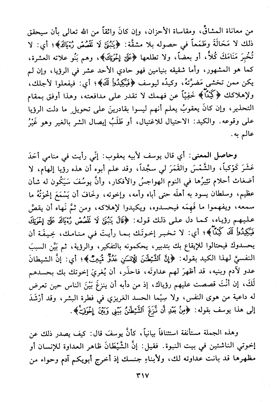 وحاصل المعنى: أي قال يوسف لأبيه يعقوب: إني رأيت في منامي أحَدَ عَشَرَ كَوْكبًا، والشَّمْسَ والقَمَرَ لي سجَّدًا، وقد علم أبوه أن هذه رؤيا إلهام، لا أضغاث أحلام تثِيرُها في النوم الهواجسُ والأفكار، وأنَّ يوسُفَ سَيَكُون له شأن عظيم، وسلطان يسود به أهلَه حتى أباه وأمه، وإخوته، وخَافَ أن يَسْمَعَ إخْوَتُهُ ما سمعه، ويفهموا ما فَهِمَه فيحسدوه، ويكيدوا لإهلاكه، ومن ثمَّ نَهاه أن يقصَّ عليهم رؤياه، كما دل على ذلك قوله: {قَالَ يَا بُنَيَّ لَا تَقْصُصْ رُؤْيَاكَ عَلَى إِخْوَتِكَ فَيَكِيدُوا لَكَ كَيْدًا}؛ أي: لا تخبر إخوتَك بما رأيتَ في منامك، خِيفَة أن يحسدوك فيحتالوا للإيقاع بك بتدبير، يحكمونه بالتفكير، والرؤية، ثم بَيَّن السببَ النفسيَّ لهذا الكيد بقوله: {إِنَّ الشَّيْطَانَ لِلْإِنْسَانِ عَدُوٌّ مُبِينٌ}؛ أي: إنَّ الشيطانَ عدو لآدم وبنيه، قد أظهرَ لهم عداوتَه، فاحذَر، أن يُغريَ إخوتك بك بحسدهم لَكَ، إن أنْتَ قصصت عليهم رؤياك، إذ من دأبه أن ينزغَ بَيْنَ الناس حين تعرض له داعية من هوى النفس، ولا سِيّما الحسد الغريزي في فطرة البشر، وقد أرْشَدَ إلى هذا يوسف بقوله: {مِنْ بَعْدِ أَنْ نَزَغَ الشَّيْطَانُ بَيْنِي وَبَيْنَ إِخْوَتِي}.