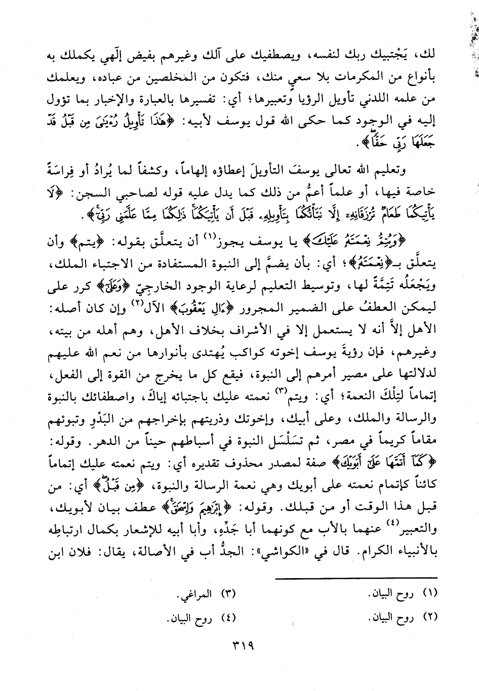 لك، يَجْتبيك ربك لنفسه، ويصطفيك على آلك وغيرهم بفيض إلهي يكملك به بأنواع من المكرمات بلا سعيٍ منك، فتكون من المخلصين من عباده، ويعلمك من علمه اللدني تأويل الرؤيا وتعبيرها؛ أي: تفسيرها بالعبارة والإخبار بما تؤول إليه في الوجود كما حكى الله قول يوسف لأبيه: {هَذَا تَأْوِيلُ رُؤْيَايَ مِنْ قَبْلُ قَدْ جَعَلَهَا رَبِّي حَقًّا}.