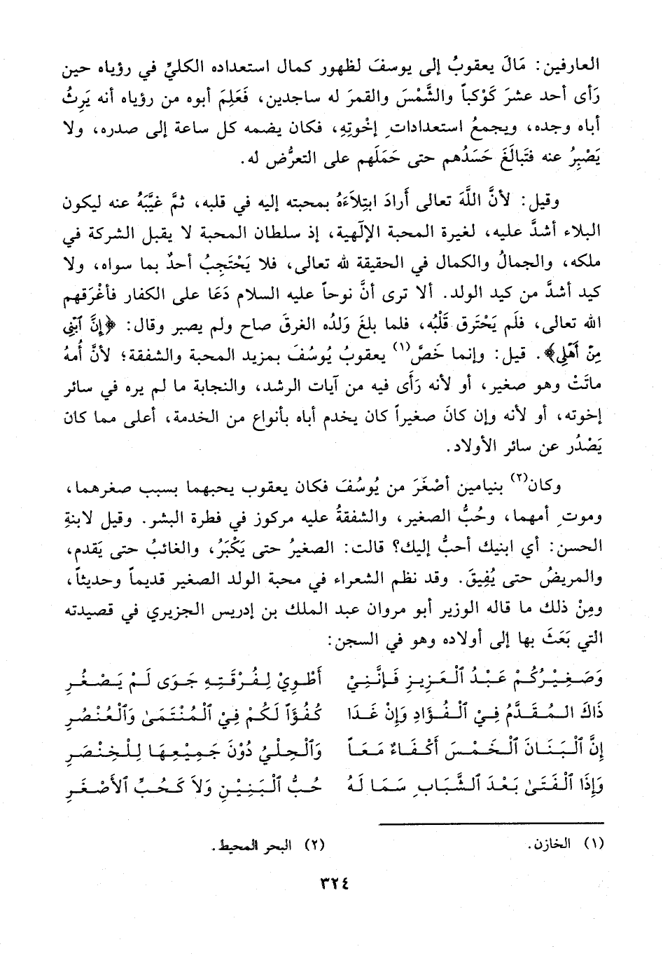 وقيل: لأنَّ اللَّهَ تعالى أَرادَ ابتِلاَءَهُ بمحبته إليه في قلبه، ثمَّ غيَّبَهُ عنه ليكون البلاء أشدَّ عليه، لغيرة المحبة الإلَهية، إذ سلطان المحبة لا يقبل الشركة في ملكه، والجمالُ والكمال في الحقيقة لله تعالى، فلا يَحْتَجِبُ أحدٌ بما سواه، ولا كيد أشدَّ من كيد الولد. ألا ترى أنَّ نوحًا عليه السلام دَعَا على الكفار فأغْرَقهم الله تعالى، فلَم يَحْتَرق قَلْبُه، فلما بلغَ وَلدُه الغرقَ صاح ولم يصبر وقال: {إِنَّ ابْنِي مِنْ أَهْلِي}. قيل: وإنما خَصَّ (¬1) يعقوبُ يُوسُفَ بمزيد المحبة والشفقة؛ لأنَّ أُمهُ ماتَتْ وهو صغير، أو لأنه رَأَى فيه من آيات الرشد، والنجابة ما لم يره في سائر إخوته، أو لأنه وإن كانَ صغيرًا كان يخدم أباه بأنواع من الخدمة، أعلى مما كان يَصْدُر عن سائر الأولاد.