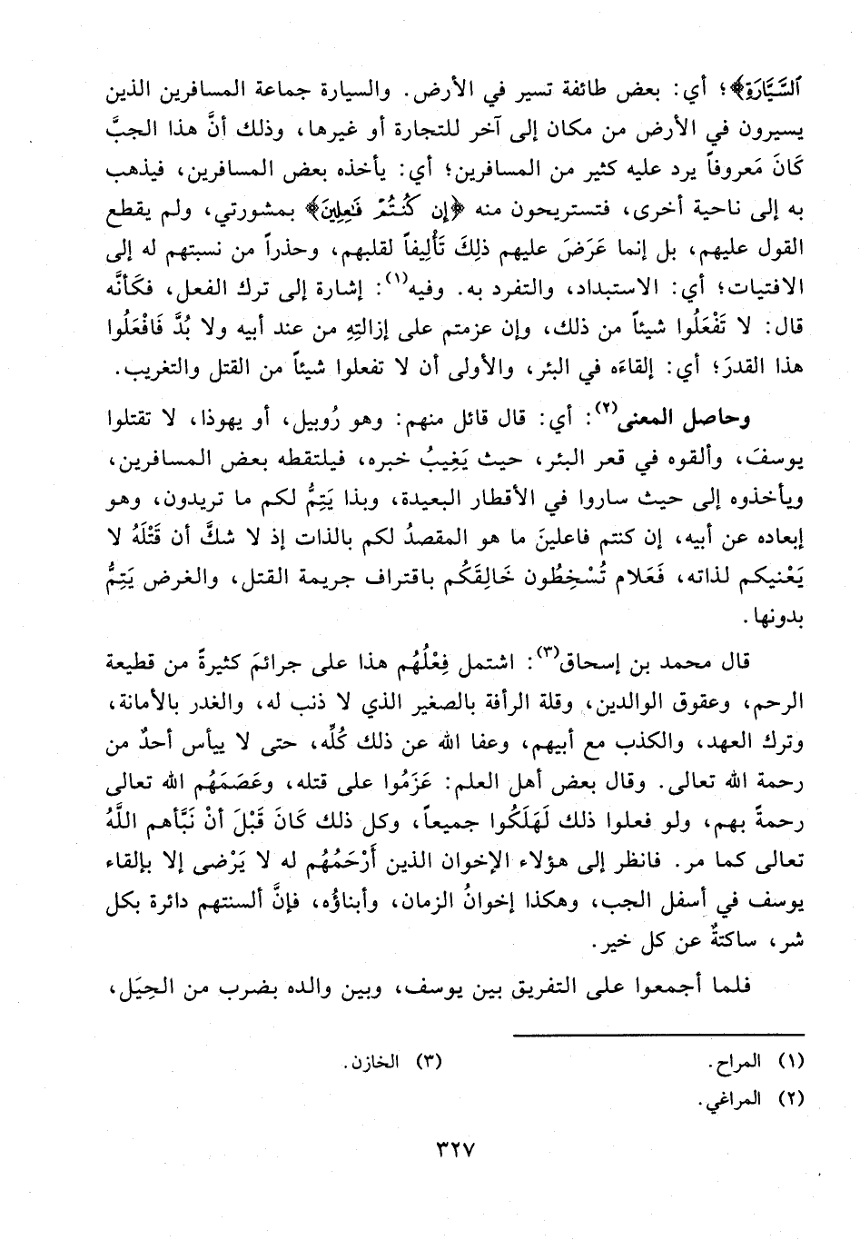 قال محمَّد بن إسحاق (¬3): اشتمل فِعْلُهُم هذا على جرائمَ كثيرةً من قطيعة الرحم، وعقوق الوالدين، وقلة الرأفة بالصغير الذي لا ذنب له، والغدر بالأمانة، وترك العهد، والكذب مع أبيهم، وعفا الله عن ذلك كُلِّه، حتى لا ييأس أحدٌ من رحمة الله تعالى. وقال بعض أهل العلم: عَزَمُوا على قتله، وعَصَمَهُم الله تعالى رحمةً بهم، ولو فعلوا ذلك لَهَلَكُوا جميعًا، وكل ذلك كَانَ قَبْلَ أنْ نَبَّأهم اللَّهُ تعالى كما مر. فانظر إلى هؤلاء الإخوان الذين أَرْحَمُهُم له لا يَرْضى إلا بإلقاء يوسف في أسفل الجب، وهكذا إخوانُ الزمان، وأبناؤُه، فإنَّ ألسنتهم دائرة بكل شر، ساكتةٌ عن كل خير.