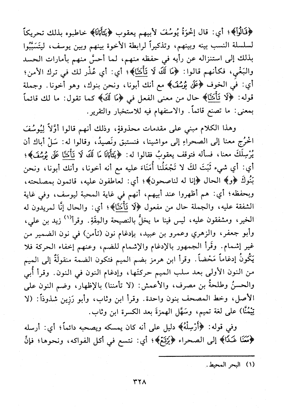 وهذا الكلام مبني على مقدمات محذوفةٍ، وذلك أنهم قالوا أوَّلًا لِيُوسُفَ اخْرُج معنا إلى الصحراءِ إلى مواشينا، فنستبق ونَصيدُ، وقالوا له: سَلْ أباك أن يُرْسِلَكَ معنا، فسأله فتوقف يعقوبُ فقالوا له: {يَا أَبَانَا مَا لَكَ لَا تَأْمَنَّا عَلَى يُوسُفَ}؛ أي: أي شيء ثَبَتَ لكَ لا تَجْعَلُنا أُمَنَاءَ عليه مع أنه أخونا، وأنك أبونا، ونحن بَنُوكَ {و} الحال {إنا له لناصحون}؛ أي: لعاطفون عليه، قائمون بمصلحته، وبحفظه؛ أي: هم أظهروا عند أبيهم، أنهم في غاية المحبة ليوسف، وفي غاية الشفقة عليه، والجملة حال من مفعول {لَا تَأْمَنَّا}؛ أي: والحال إنَّا لمريدون له الخير، ومشفقون عليه، ليس فينا ما يخلُّ بالنصيحة والمِقَةِ. وقرأ (¬1) زيد بن علي، وأبو جعفر، والزهري وعمرو بن عبيد، بإدغام نون (تأمن) في نون الضمير من غير إشمام. وقَرأ الجمهور بالإدغام والإشمام للضم، وعنهم إخفاء الحركة فلا يَكُونُ إدغامًا مَحْضًا. وقرأ ابن هرمز بضم الميم فتكون الضمة منقولَةٌ إلى الميم من النون الأولى بعد سلب الميم حركتَها، وإدغام النون في النون. وقرأ أُبي والحسنُ وطلحةُ بن مصرف، والأعمش: (لا تأمننا) بالإظهار، وضم النون على الأصل، وخط المصحف بنون واحدة. وقرأ ابن وثاب، وأبو رَزِين شذوذًا: (لا تِيْمُنَّا) على لغة تميم، وسَهَّل الهمزةَ بعد الكسرة ابن وثاب.