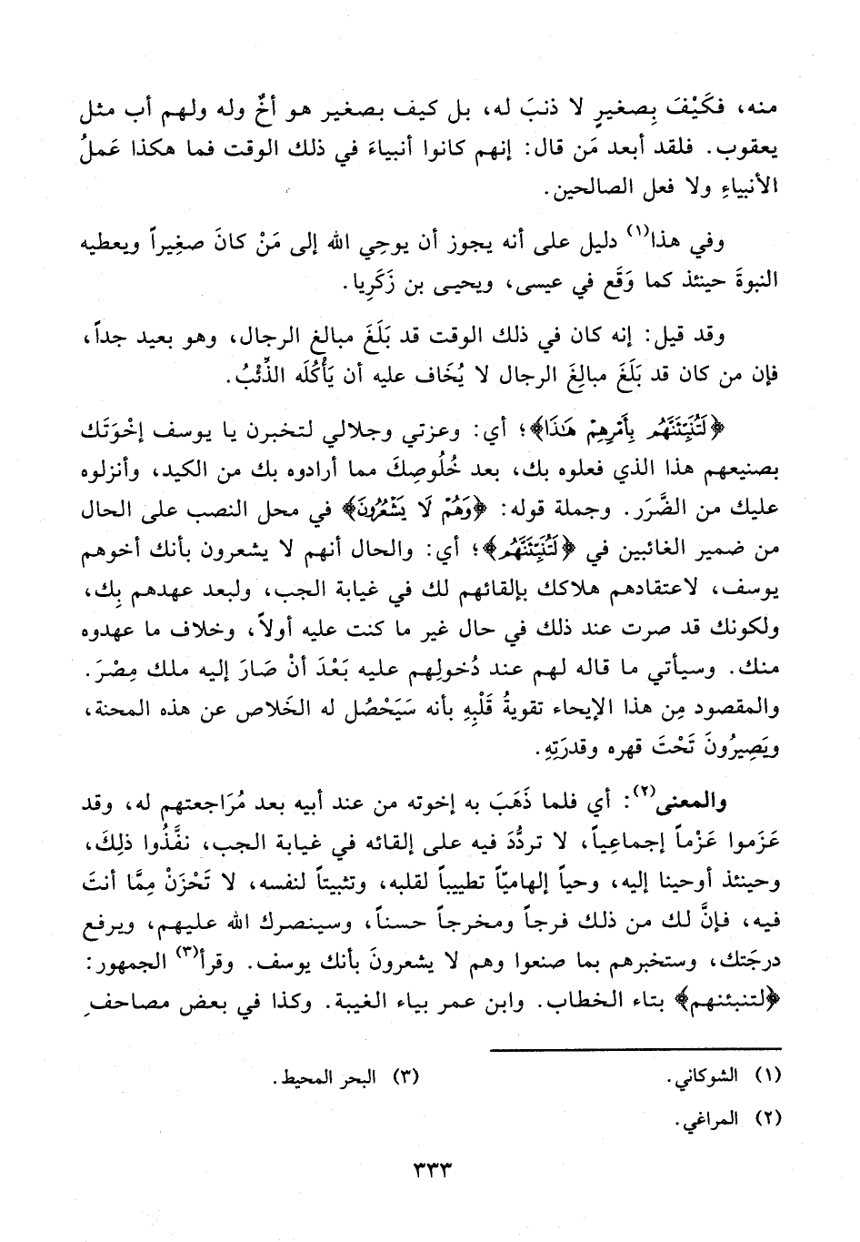 منه، فكَيْفَ بِصغيرٍ لا ذنبَ له، بل كيف بصغير هو أخٌ وله ولهم أب مثل يعقوب. فلقد أبعد مَن قال: إنهم كانوا أنبياءَ في ذلك الوقت فما هكذا عَملُ الأنبياءِ ولا فعل الصالحين.