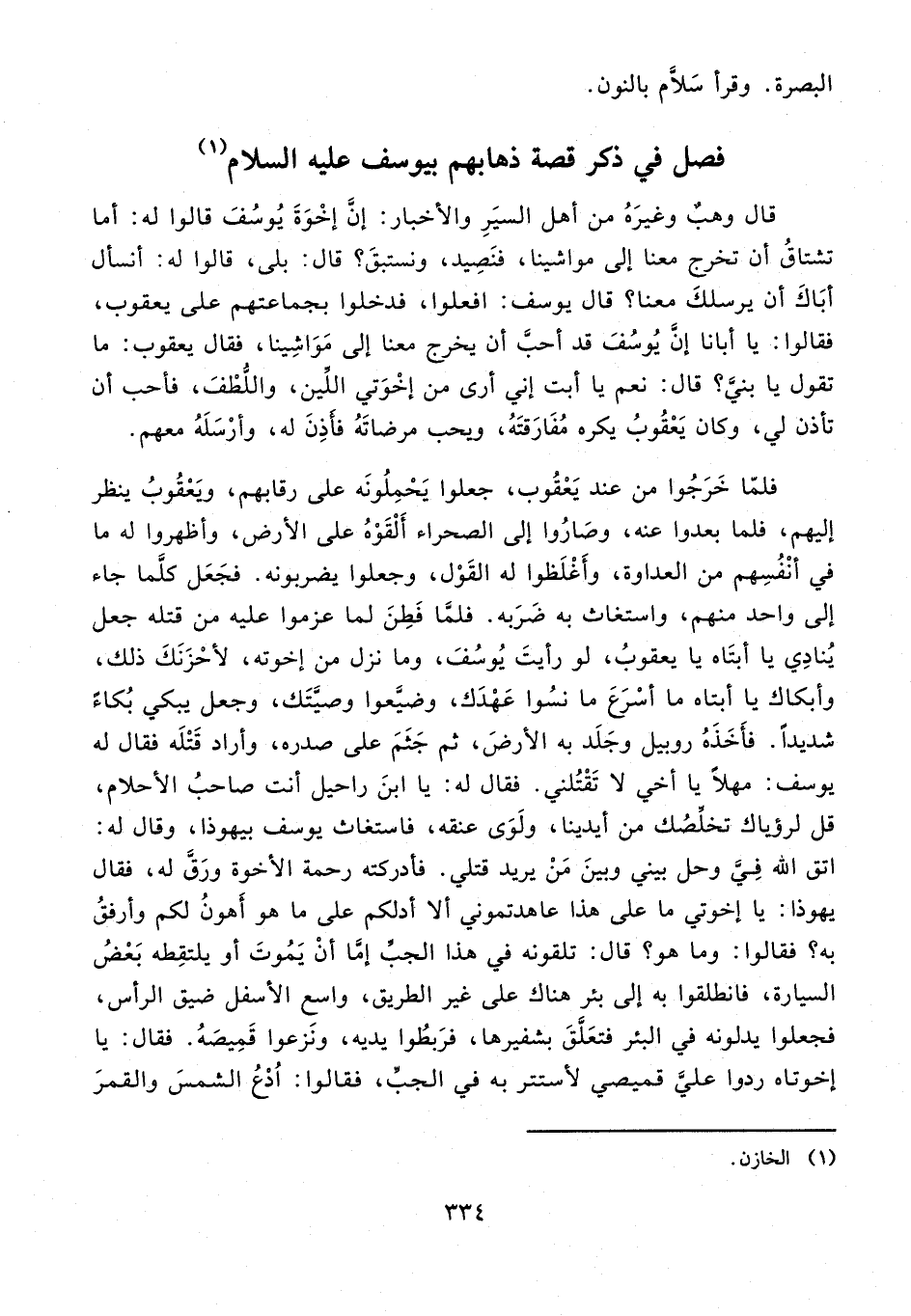 فلمّا خَرَجُوا من عند يَعْقُوب، جعلوا يَحْمِلُونَه على رقابهم، ويَعْقُوبُ ينظر إليهم، فلما بعدوا عنه، وصَارُوا إلى الصحراء أَلْقَوْهُ على الأرض، وأظهروا له ما في أنْفُسِهم من العداوة، وأَغْلَظوا له القَوْل، وجعلوا يضربونه. فجَعَل كلَّما جاء إلى واحد منهم، واستغاث به ضَرَبه. فلمَّا فَطِنَ لما عزموا عليه من قتله جعل يُنادِي يا أبتَاه يا يعقوبُ، لو رأيتَ يُوسُفَ، وما نزل من إخوته، لأحْزَنَكَ ذلك، وأبكاك يا أبتاه ما أسْرَعَ ما نسُوا عَهْدَك، وضيَّعوا وصيَّتَك، وجعل يبكي بُكاءً شديدًا. فأَخَذَهُ روبيل وجَلَد به الأرضَ، ثم جَثَمَ على صدره، وأراد قَتْلَه فقال له يوسف: مهلًا يا أخي لا تَقْتُلني. فقال له: يا ابنَ راحيل أنت صاحبُ الأحلام، قل لرؤياك تخلِّصُك من أيدينا, ولَوَى عنقه، فاستغاث يوسف بيهوذا، وقال له: اتق الله فِيَّ وحل بيني وبينَ مَنْ يريد قتلي. فأدركته رحمة الأخوة ورَقَّ له، فقال يهوذا: يا إخوتي ما على هذا عاهدتموني ألا أدلكم على ما هو أَهونُ لكم وأرفقُ به؟ فقالوا: وما هو؟ قال: تلقونه في هذا الجبِّ إمَّا أنْ يَمُوتَ أو يلتقِطه بَعْضُ السيارة، فانطلقوا به إلى بئر هناك على غير الطريق، واسع الأسفل ضيق الرأس، فجعلوا يدلونه في البئر فتعَلَّقَ بشفيرها، فرَبطُوا يديه، ونَزعوا قَمِيصَهُ. فقال: يا إخوتاه ردوا عليَّ قميصي لأستتر به في الجبِّ، فقالوا: اُدْعُ الشمسَ والقمرَ