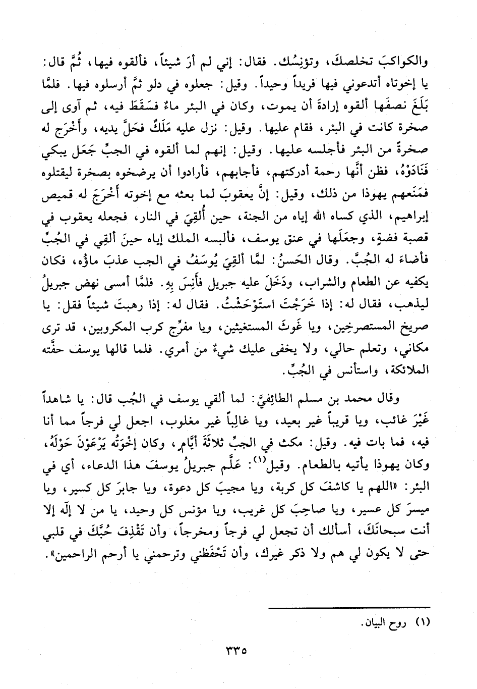 والكواكبَ تخلصكَ، وتؤنِسُك. فقال: إني لم أرَ شيئًا، فألقوه فيها، ثُمَّ قال: يا إخوتاه أتدعوني فيها فريدًا وحيدًا. وقيل: جعلوه في دلو ثمَّ أرسلوه فيها. فلمَّا بَلَغَ نصفَها ألقوه إرادةَ أن يموت، وكان في البئر ماءٌ فسَقَطَ فيه، ثم آوى إلى صخرة كانت في البئر، فقام عليها. وقيل: نزل عليه مَلَكٌ فحَلَّ يديه، وأَخْرَج له صخرةً من البئر فأجلسه عليها. وقيل: إنهم لما ألقوه في الجبِّ جَعَل يبكي فَنَادَوْهُ، فظن أنَّها رحمة أدركتهم، فأجابهم، فأرادوا أن يرضخوه بصخرة ليقتلوه فمَنَعهم يهوذا من ذلك، وقيل: إنَّ يعقوبَ لما بعثه مع إخوته أَخْرَجَ له قميص إبراهيم، الذي كساه الله إياه من الجنة، حين أُلقِيَ في النار، فجعله يعقوب في قصبة فضةٍ، وجعَلَها في عنق يوسف، فألبسه الملك إياه حينَ ألقِي في الجُبِّ فأضاءَ له الجُبَّ. وقال الحَسنُ: لمَّا ألقِيَ يُوسَفُ في الجب عذبَ ماؤُه، فكان يكفيه عن الطعام والشراب، ودَخَلَ عليه جبريل فأَنِسَ بِهِ. فلمَّا أمسى نهض جبريلُ ليذهب، فقال له: إذا خَرَجْتَ استَوْحَشْتُ. فقال له: إذا رهبتَ شيئًا فقل: يا صريخ المستصرخِين، ويا غَوثَ المستغيثين، ويا مفرِّج كرب المكروبين، قد ترى مكاني، وتعلم حالي، ولا يخفى عليك شيءٌ من أمري. فلما قالها يوسف حفَّته الملائكة، واستأنس في الجُبِّ.