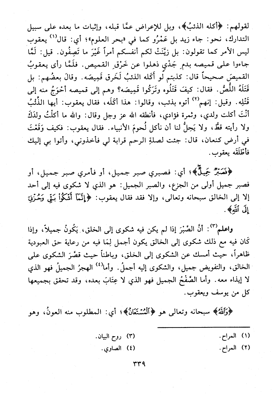 واعلم (¬3): أنَّ الصَّبْرَ إذا لم يكن فيه شكوى إلى الخلق، يَكُونُ جميلًا، وإذا كَان فيه مع ذلك شكوى إلى الخالق يكون أجمل لِمَا فيه من رعاية حق العبودية ظاهرًا، حيث أمسك عن الشكوى إلى الخلق، وباطنًا حيث قصَّرَ الشكوى على الخالق، والتفويض جميل، والشكوى إليه أجملُ. وأما (¬4) الهجرُ الجميلُ فهو الذي لا إيذاء معه. وأما الصَّفْحُ الجميل فهو الذي لا عِتَابَ بعده، وقد تحقق بجميعها كل من يوسف ويعقوب.