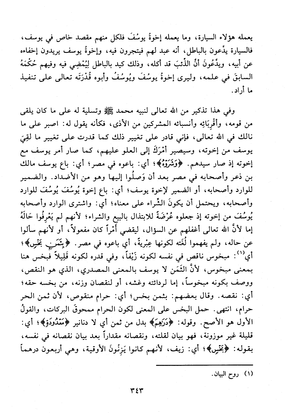 وفي هذا تذكير من الله تعالى لنبيه محمد - صلى الله عليه وسلم - وتسلية له على ما كان يلقى من قومه، وأقْرِبَائِه وأنسبائه المشركين من الأذى، فكأنه يقول له: اصبر على ما نالك في الله تعالى، فإني قادر على تغيير ذلك كما قدرت على تغيير ما لقِيَ يوسف من إخوته، وسيصير أمْرَكَ إلى العلو عليهم، كما صار أمر يوسف مع إخوته إذ صار سيدهم. {وَشَرَوْهُ}؛ أي: باعوه في مصر؛ أي: باع يوسف مالك بن ذعر وأصحابه في مصر بعد أن وَصلُوا إليها وهو من الأضداد. والضمير للوارد وأصحابه، أو الضمير لإخوة يوسف؛ أي: باع إخوة يُوسُفَ يُوسُفَ للوارد وأصحابه، ويحتمل أن يكونَ الشِّراء على معناه؛ أي: واشترى الوارد وأصحابه يُوسُفَ من إخوته إذ جعلوه عُرْضَةً للابتذال بالبيع والشراء؛ لأنهم لم يَعْرِفُوا حَالَهُ إما لأنَّ الله تعالى أغفلهم عن السؤال، ليقضي أَمْرًا كان مفعولًا، أو لأنهم سألوا عن حاله، ولم يفهموا لُغَته لكونها عِبْريةً، أي باعوه في مصر. {بِثَمَنٍ بَخْسٍ}؛ أي (¬1): مبخوس ناقص في نفسه لكونه زَيْفًا، وفي قدره لكونه قَلِيلًا فبخس هنا بمعنى مبخوس؛ لأنَّ الثَمَن لا يوسف بالمعنى المصدري، الذي هو النقص، ووصف بكونه مبخوسًا، إما لردائته وغشه، أو لنقصان وزنه، من بخسه حقه؛ أي: نقصه. وقال بعضهم: بثمن بخس؛ أي: حرام منقوص، لأن ثمن الحر حرام، انتهى. حمل البخس على المعنى لكون الحرام ممحوقَ البركات، والقولُ الأول هو الأصح. وقوله: {دَرَاهِمَ} بدل من ثمن أي لا دنانير {مَعْدُودَةٍ}؛ أي: قليلة غير موزونة، فهو بيان لقلته، ونقصانه مقدارًا بعد بيان نقصانه في نفسه، بقوله: {بَخْسٍ}؛ أي: زيف, لأنهم كانوا يَزِنُونَ الأوقية، وهي أربعون درهمًا