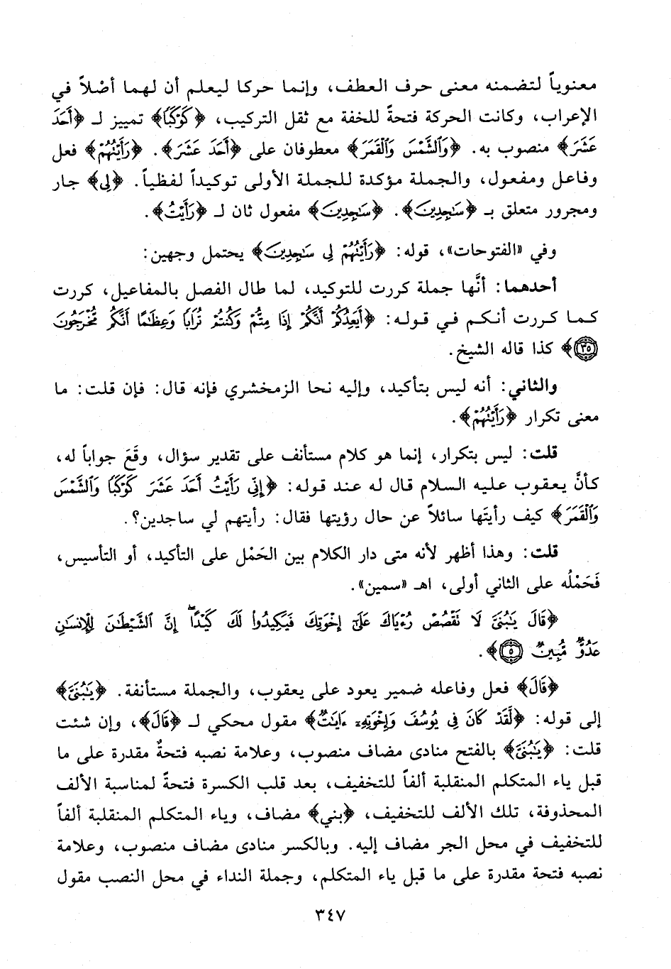 معنويًّا لتضمنه معنى حرف العطف، وإنما حركا ليعلم أو لهما أصْلًا في الإعراب، وكانت الحركة فتحةً للخفة مع ثقل التركيب، {كَوْكَبًا} تمييز لـ {أَحَدَ عَشَرَ} منصوب به. {وَالشَّمْسَ وَالْقَمَرَ} معطوفان على {أَحَدَ عَشَرَ}. {رَأَيْتُهُمْ} فعل وفاعل ومفعول، والجملة مؤكدة للجملة الأولى توكيدًا لفظيًّا. {لِي} جار ومجرور متعلق بـ {سَاجِدِينَ}. {سَاجِدِينَ} مفعول ثان لـ {رَأَيْتُ}.