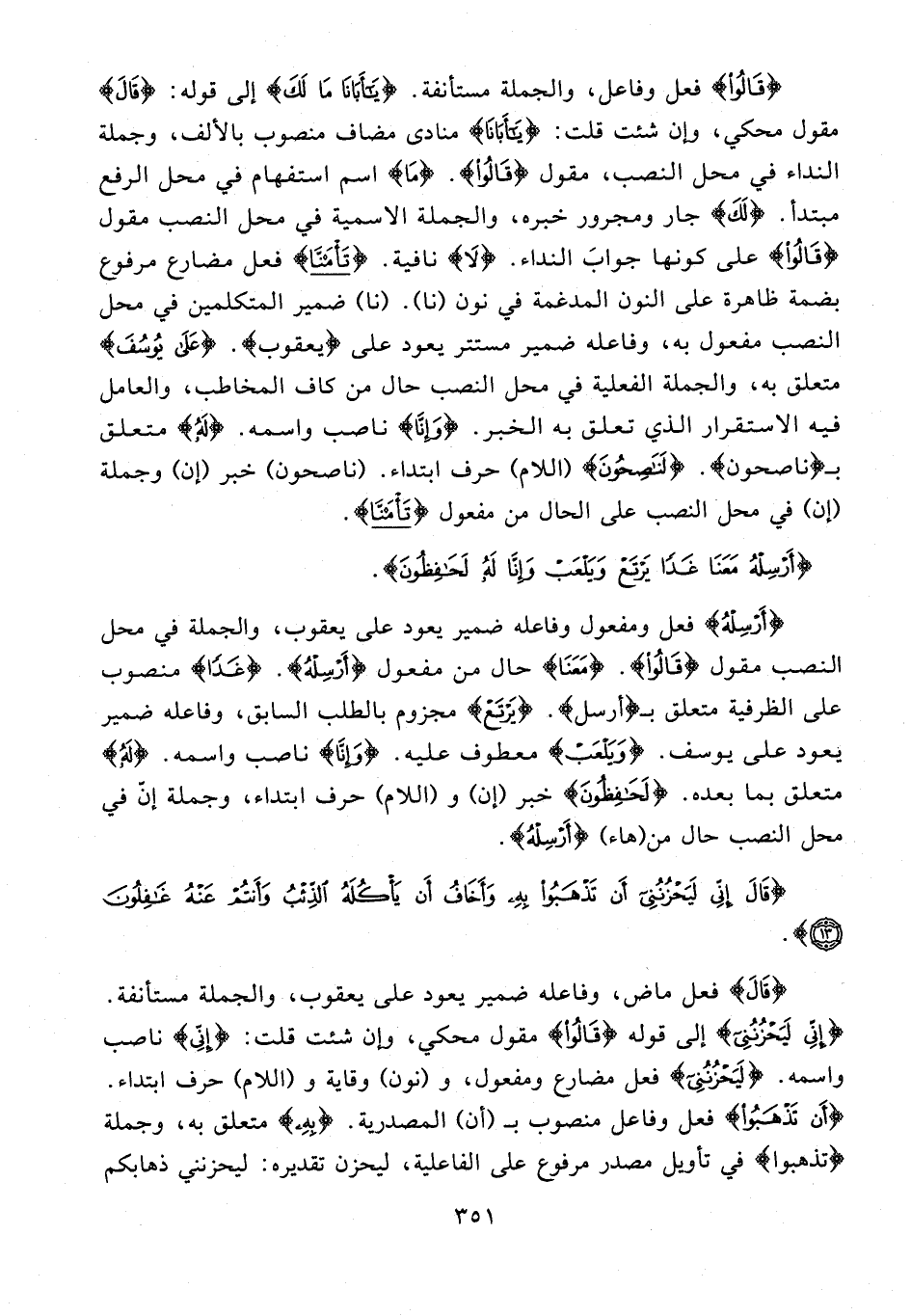 {قَالَ} فعل ماض، وفاعله ضمير يعود على يعقوب، والجملة مستأنفة. {إِنِّي لَيَحْزُنُنِي} إلى قوله {قَالوُا} مقول محكي، وإن شئت قلت: {إِنِّي} ناصب واسمه. {لَيَحْزُنُنِي} فعل مضارع ومفعول، و (نون) وقاية و (اللام) حرف ابتداء. {أَنْ تَذْهَبُوا} فعل وفاعل منصوب بـ (أن) المصدرية. {بِهِ} متعلق به، وجملة {تذهبوا} في تأويل مصدر مرفوع على الفاعلية، ليحزن تقديره: ليحزنني ذهابكم
