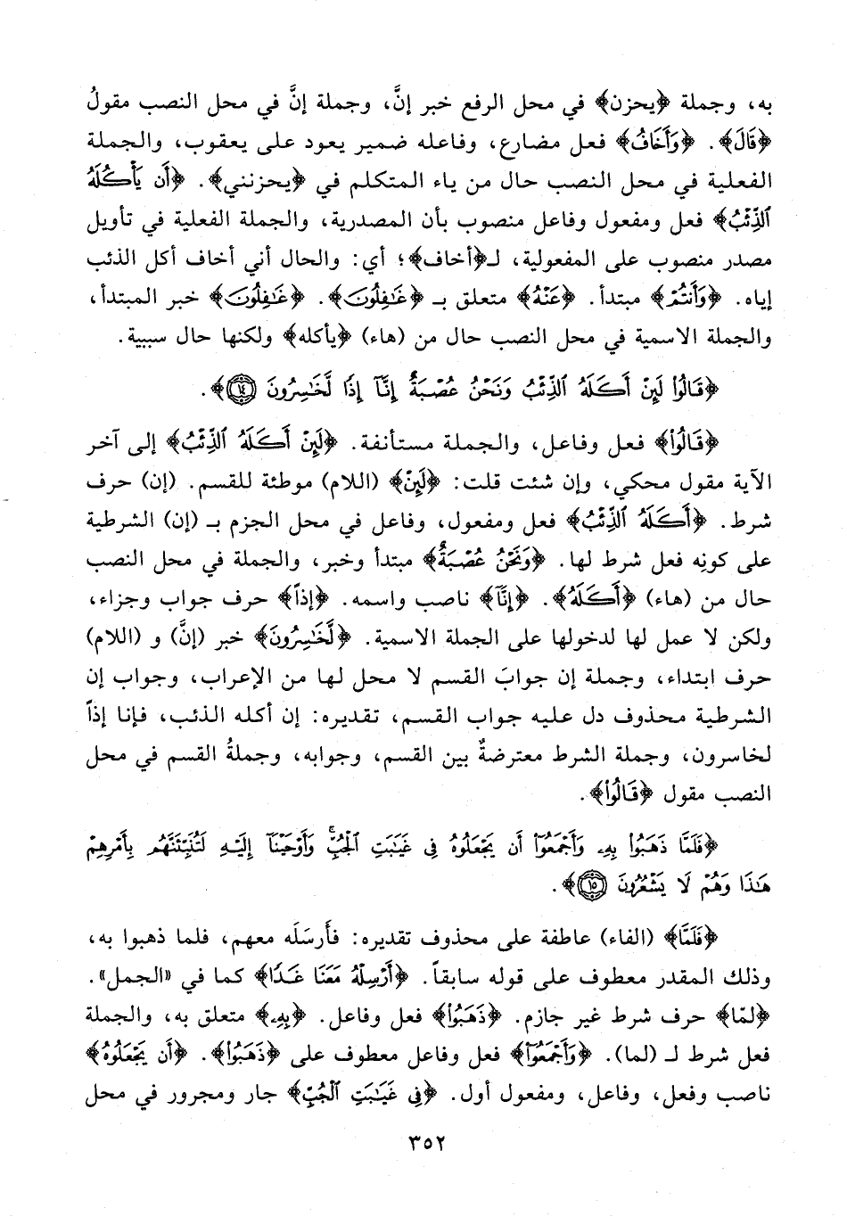 به، وجملة {يحزن} في محل الرفع خبر إنَّ، وجملة إنَّ في محل النصب مقولُ {قَالَ}. {وَأَخَافُ} فعل مضارع، وفاعله ضمير يعود على يعقوب، والجملة الفعلية في محل النصب حال من ياء المتكلم في {يحزنني}. {أَنْ يَأْكُلَهُ الذِّئْبُ} فعل ومفعول وفاعل منصوب بأن المصدرية، والجملة الفعلية في تأويل مصدر منصوب على المفعولية، لـ {أخاف}؛ أي: والحال أني أخاف أكل الذئب إياه. {وَأَنْتُمْ} مبتدأ. {عَنهُ} متعلق بـ {غَافِلُونَ}. {غَافِلُونَ} خبر المبتدأ، والجملة الاسمية في محل النصب حال من (هاء) {يأكله} ولكنها حال سببية.
