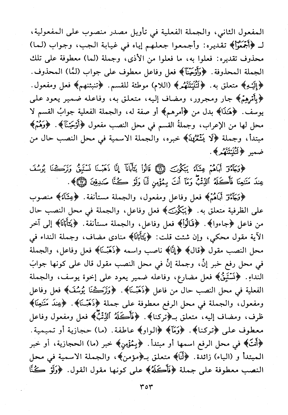 {وَجَاءُوا أَبَاهُمْ} فعل وفاعل ومفعول، والجملة مستأنفة. {عِشَاءً} منصوب على الظرفية متعلق به. {يَبْكُونَ} فعل وفاعل، والجملة في محل النصب حال من فاعل {جاءوا}. {قَالُوا} فعل وفاعل، والجملة مستأنفة. {يَا أَبَانَا} إلى آخر الآية مقول محكي، وإن شئت قلت: {يَا أَبَانَا} منادى مضاف، وجملة النداء في محل النصب مقول {قال} {إِنَّا} ناصب واسمه {ذَهَبْنَا} فعل وفاعل، والجملة في محل رفع خبر إنَّ، وجملة إنَّ في محل النصب مقول قال على كونها جوابَ النداءِ. {نَسْتَبِقُ} فعل مضارع، وفاعله ضمير يعود على إخوة يوسف، والجملة الفعلية في محل النصب حال من فاعل {ذَهَبْنَا}. {وَتَرَكْنَا يُوسُفَ} فعل وفاعل ومفعول، والجملة في محل الرفع معطوفة على جملة {ذَهَبنَا}. {عِندَ متاعنا} ظرف، ومضاف إليه، متعلق بـ {تركنا}. {فَأَكَلَهُ الذِّئْبُ} فعل ومفعول وفاعل معطوف على {تركنا}. {وَمَا} {الواو} عاطفة. (ما) حجازية أو تميمية. {أنتَ} في محل الرفع اسمها أو مبتدأ. {بِمُؤْمِنٍ} خبر (ما) الحجازية، أو خبر المبتدأ و (الباء) زائدة. {لَّنَا} متعلق بـ {مؤمن}، والجملة الاسمية في محل النصب معطوفة على جملة {فَأَكَلَهُ} على كونها مقول القول. {وَلَوْ كُنَّا