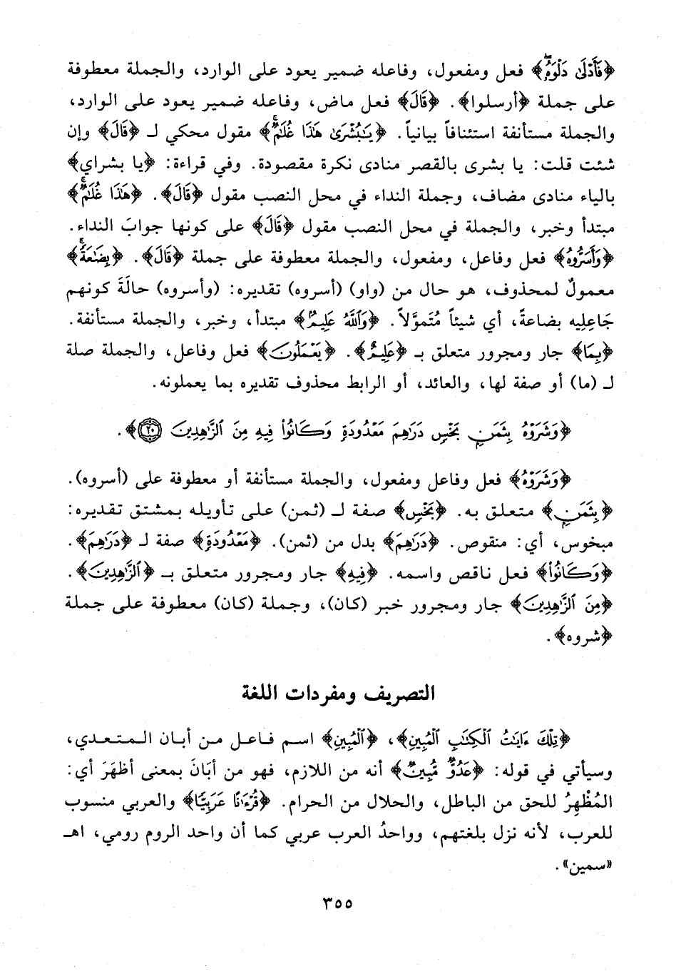 {وَشَرَوْهُ} فعل وفاعل ومفعول، والجملة مستأنفة أو معطوفة على (أسروه). {بِثَمَنٍ} متعلق به. {بَخْسٍ} صفة لـ (ثمن) على تأويله بمشتق تقديره: مبخوس، أي: منقوص. {دَرَاهِمَ} بدل من (ثمن). {مَعْدُودَةٍ} صفة لـ {دَرَاهِمَ}. {مِنَ الزَّاهِدِينَ} فعل ناقص واسمه. {فِيهِ} جار ومجرور متعلق بـ {الزَّاهِدِينَ}. {مِنَ الزَّاهِدِينَ} جار ومجرور خبر (كان)، وجملة (كان) معطوفة على جملة {أشَرَوْهُ}.