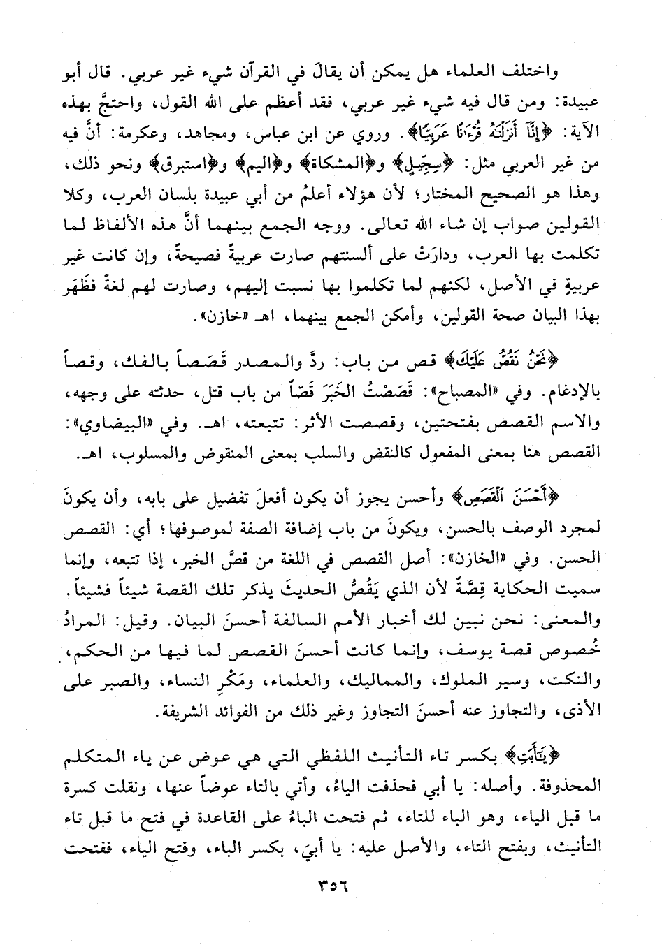 واختلف العلماء هل يمكن أن يقالَ في القرآن شيء غير عربي. قال أبو عبيدة: ومن قال فيه شيء غير عربي، فقد أعظم على الله القول، واحتجَّ بهذه الآية: {إنَّا أَنْزَلْنَاهُ قُرْآنًا عَرَبِيًّا}. وروي عن ابن عباس، ومجاهد، وعكرمة: أنَّ فيه عن غير العربي مثل: {سِجِّيلٍ} و {المشكاة} و {اليم} و {استبرق} ونحو ذلك، وهذا هو الصحيح المختار؛ لأن هؤلاء أعلمُ عن أبي عبيدة بلسان العرب، وكلا القولين صواب إن شاء الله تعالى. ووجه الجمع بينهما أنَّ هذه الألفاظ لما تكلمت بها العرب، ودارَتْ على ألسنتهم صارت عربيةً فصيحةً، وإن كانت غير عربيةٍ في الأصل، لكنهم لما تكلموا بها نسبت إليهم، وصارت لهم لغةً فظَهَر بهذا البيان صحة القولين، وأمكن الجمع بينهما، اهـ "خازن".