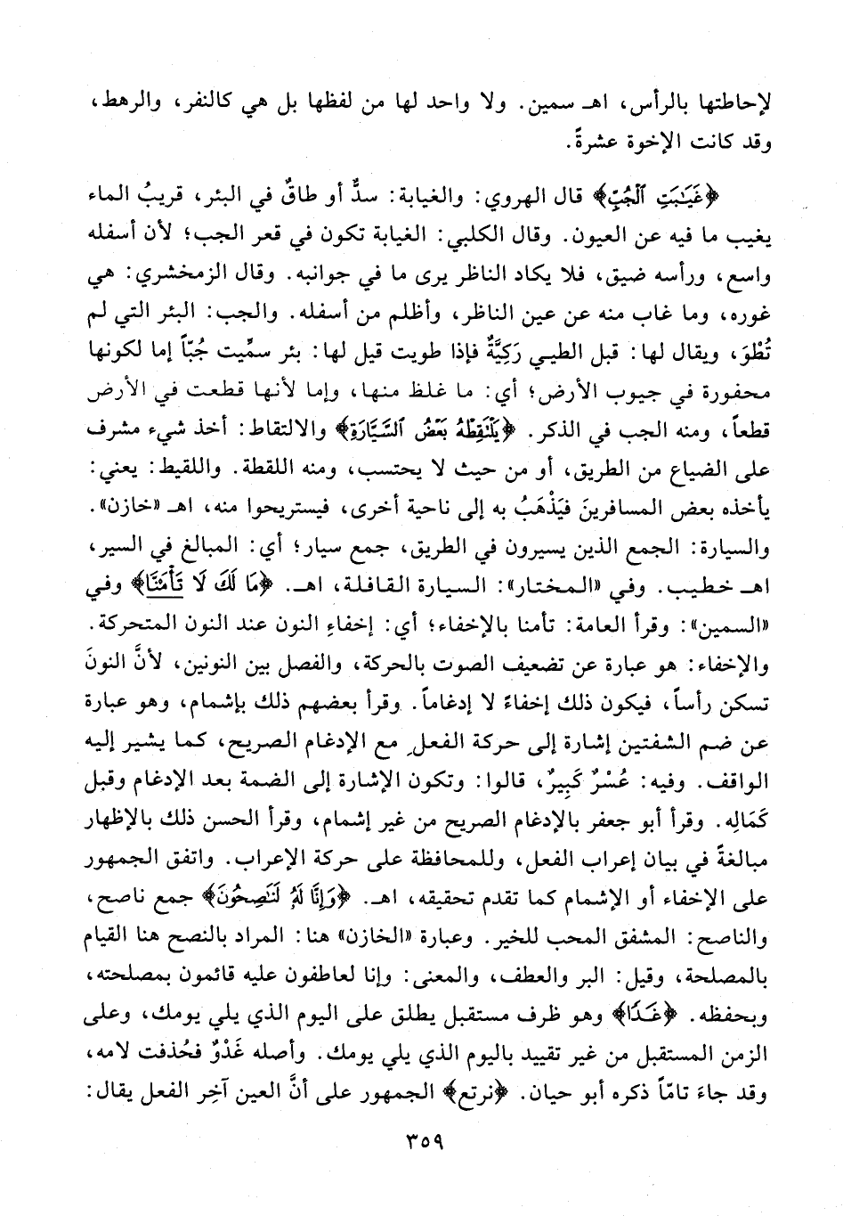 {غَيَابَتِ الْجُبِّ} قال الهروي: والغيابة: سدٌّ أو طاقٌ في البئر، قريبُ الماء يغيب ما فيه عن العيون. وقال الكلبي: الغيابة تكون في قعر الجب؛ لأن أسفله واسع، ورأسه ضيق، فلا يكاد الناظر يرى ما في جوانبه. وقال الزمخشري: هي غوره، وما غاب منه عن عين الناظر، وأظلم من أسفله. والجب: البئر التي لم تُطْوَ، ويقال لها: قبل الطيي رَكِيَّةٌ فإذا طويت قيل لها: بئر سمِّيت جُبًّا إما لكونها محفورة في جيوب الأرض؛ أي: ما غلظ منها، وإما لأنها قطعت في الأرض قطعًا، ومنه الجب في الذكر. {يَلْتَقِطْهُ بَعْضُ السَّيَّارَةِ} والالتقاط: أخذ شيء مشرف على الضياع من الطريق، أو من حيث لا يحتسب، ومنه اللقطة. واللقيط: يعني: يأخذه بعض المسافرينَ فيَذْهَبُ به إلى ناحية أخرى، فيستريحوا منه، اهـ "خازن". والسيارة: الجمع الذين يسيرون في الطريق، جمع سيار؛ أي: المبالغ في السير، اهـ خطيب. وفي "المختار": السيارة القافلة، اهـ. {مَا لَكَ لَا تَأْمَنَّا} وفي "السمين": وقرأ العامة: تأمنا بالإخفاء؛ أي: إخفاءِ النون عند النون المتحركة. والإخفاء: هو عبارة عن تضعيف الصوت بالحركة، والفصل بين النونين؛ لأنَّ النونَ تسكن رأسًا، فيكون ذلك إخفاءً لا إدغامًا .. وقرأ بعضهم ذلك بإشمام، وهو عبارة عن ضم الشفتين إشارة إلى حركة الفعلِ مع الإدغام الصريح، كما يشير إليه الواقف. وفيه: عُسْرٌ كَبِيرٌ، قالوا: وتكون الإشارة إلى الضمة بعد الإدغام وقبل كَمَالِه. وقرأ أبو جعفر بالإدغام الصريح من غير إشمام، وقرأ الحسن ذلك بالإظهار مبالغةً في بيان إعراب الفعل، وللمحافظة على حركة الإعراب. واتفق الجمهور على الإخفاء أو الإشمام كما تقدم تحقيقه، اهـ. {وَإِنَّا لَهُ لَنَاصِحُونَ} جمع ناصح، والناصح: المشفق المحب للخير. وعبارة "الخازن" هنا: المراد بالنصح هنا القيام بالمصلحة، وقيل: البر والعطف، والمعنى: وإنا لعاطفون عليه قائمون بمصلحته، وبحفظه. {غَدًا} وهو ظرف مستقبل يطلق على اليوم الذي يلي يومك، وعلى الزمن المستقبل من غير تقييد باليوم الذي يلي يومك. وأصله غَدْوٌ فحُذفت لامه، وقد جاءَ تامًّا ذكره أبو حيان. {نرتع} الجمهور على أنَّ العين آخِر الفعل يقال: