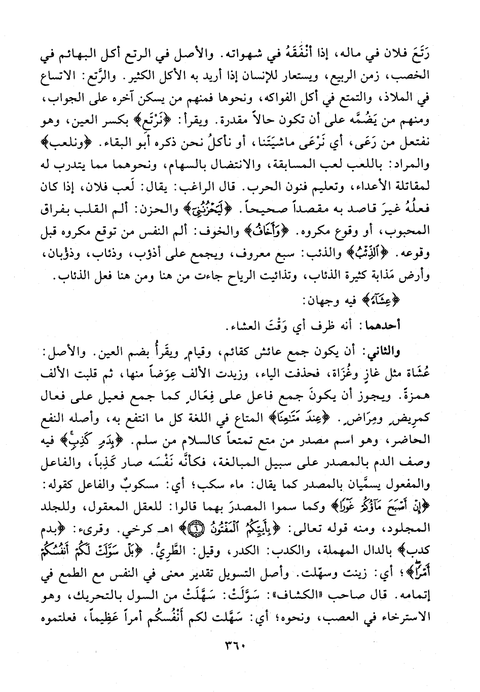 رَتَعَ فلان في ماله، إذا أنْفَقَهُ في شهواته. والأصل في الرتع أكل البهائم في الخصب، زمن الربيع، ويستعار للإنسان إذا أريد به الأكل الكثير. والرَّتع: الاتساع في الملاذ، والتمتع في أكل الفواكه، ونحوها فمنهم من يسكن آخره على الجواب، ومنهم من يَضُمَّه على أن تكون حالًا مقدرة. ويقرأ: {نَرْتَعِ} بكسر العين، وهو نفتعل من رَعَى، أي نَرْعَى ماشيَتَنا، أو نأكلُ نحن ذكره أبو البقاء. {ونلعب} والمراد باللعب لعب المسابقة، والانتضال بالسهام، ونحوهما مما يتدرب له لمقاتلة الأعداء، وتعليم فنون الحرب. قال الراغب: يقال: لَعب فلان، إذا كان فعلُهُ غيرَ قاصد به مقصدًا صحيحًا. {لَيَحْزُنُنِي} والحزن: ألم القلب بفراق المحبوب، أو وقوع مكروه. {وَأَخَافُ} والخوف: ألم النفس من توقع مكروه قبل وقوعه. {الذِّئْبُ} والذئب: سبع معروف، ويجمع على أذؤب، وذئاب، وذؤبان، وأرض مَذابة كثيرة الذئاب، وتذائيت الرياح جاءت من هنا ومن هنا فعل الذئاب.