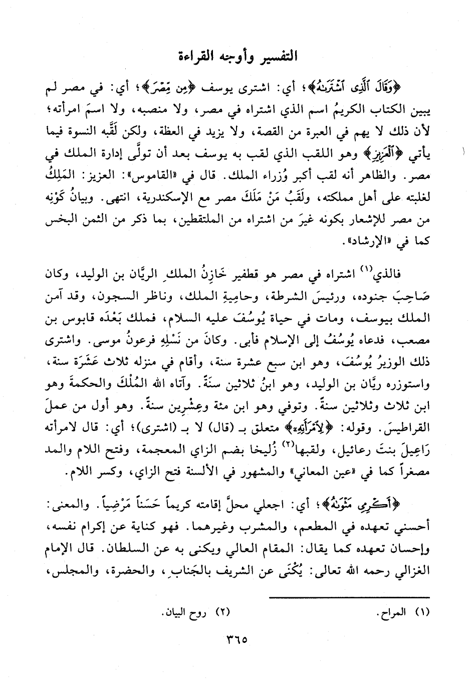 21 - {وَقَالَ الَّذِي اشْتَرَاهُ}؛ أي: اشترى يوسف {مِنْ مِصْرَ}؛ أي: في مصر لم يبين الكتاب الكريمُ اسم الذي اشتراه في مصر، ولا منصبه، ولا اسمَ امرأته؛ لأن ذلك لا يهم في العبرة من القصة، ولا يزيد في العظة، ولكن لَقَّبه النسوة فيما يأتي {العزيز} وهو اللقب الذي لقب به يوسف بعد أن تولَّى إدارة الملك في مصر. والظاهر أنه لقب أكبر وُزراء الملك. قال في "القاموس": العزيز: المَلِكُ لغلبته على أهل مملكته، ولَقَبُ مَنْ مَلَكَ مصر مع الإسكندرية، انتهى. وبيانُ كَوْنِه من مصر للإشعار بكونه غيرَ من اشتراه من الملتقطين، بما ذكر من الثمن البخس كما في "الإرشاد".