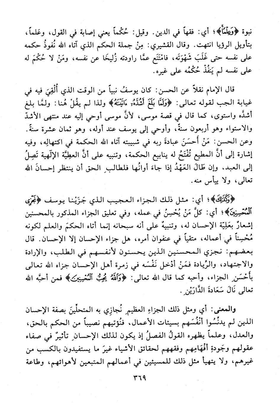 والمعنى: أي ومثل ذلك الجزاءِ العظيمِ نُجازِي به المتحلِّينَ بصفة الإحسان الذين لم يدنِّسُوا أنْفُسَهم بسيئات الأعمال، فنُؤتيهم نصيبًا من الحكم بالحق، والعدل، وعلمًا يظهره القولُ الفصلُ إذ يكون لذلك الإحسانِ تأثيرٌ في صفاء عقولهم وجَودةِ أفْهَامِهم وفقههم لحقائق الأشياء غيرَ ما يستفيدون بالكسب من غيرهم، ولا يتهيأ مثل ذلك للمسيئين في أعمالهم المتبعين لأهوائهم، وطاعة