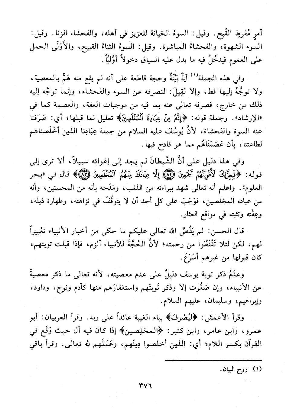 وفي هذا دليل على أنَّ الشَّيطانَ لم يجد إلى إغوائه سبيلًا، ألا ترى إلى قوله: {فَبِعِزَّتِكَ لَأُغْوِيَنَّهُمْ أَجْمَعِينَ (82) إِلَّا عِبَادَكَ مِنْهُمُ الْمُخْلَصِينَ (83)} قال في "بحر العلوم". واعلم أنه تعالى شهد ببراءته من الذنب، ومَدَحه بأنه من المحسنين، وأنه من عباده المخلصين، فوَجَبَ على كل أحد أن لا يتوقَّفَ في نزاهته، وطهارة ذيله، وعِفَّته وتثبته في مواقع العثار.