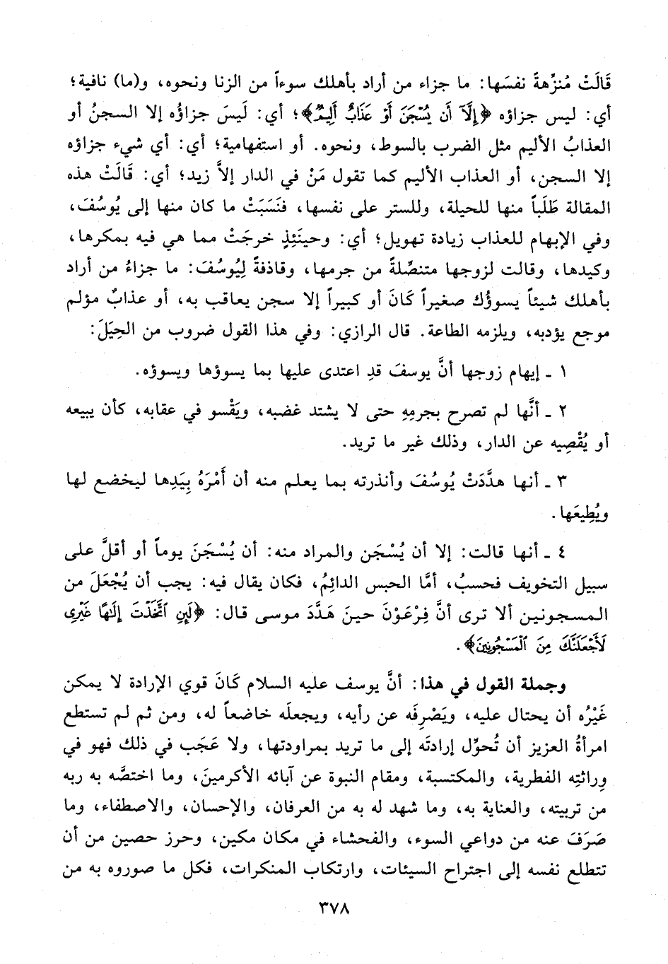 4 - أنها قالت: إلا أن يُسْجَن والمراد منه: أن يُسْجَنَ يومًا أو أقلَّ على سبيل التخويف فحسبُ، أما الحبس الدائِمُ، فكان يقال فيه: يجب أن يُجْعَلَ من المسجونين ألا ترى أنَّ فِرْعَوْنَ حينَ هَدَّدَ موسى قال: {لَئِنِ اتَّخَذْتَ إِلَهًا غَيْرِي لَأَجْعَلَنَّكَ مِنَ الْمَسْجُونِينَ}.