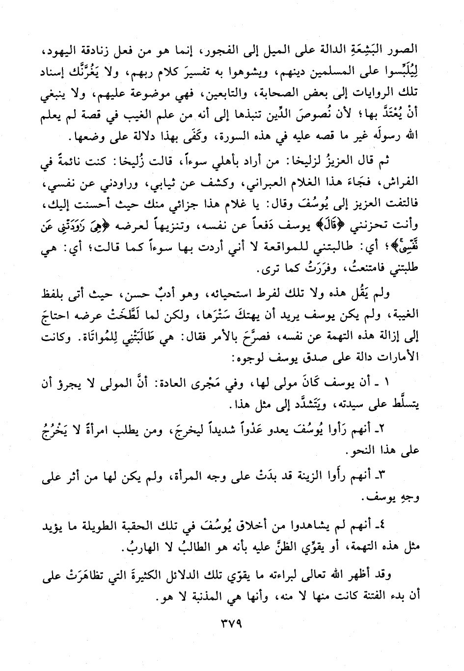 الصور البَشِعَةِ الدالة على الميل إلى الفجور، إنما هو من فعل زنادقة اليهود، لِيُلَبِّسوا على المسلمين دينهم، ويشوهوا به تفسيرَ كلام ربهم، ولا يَغُرَّنَّك إسناد تلك الروايات إلى بعض الصحابة، والتابعين، فهي موضوعة عليهم، ولا ينبغي أنْ يُعْتَدَّ بها؛ لأن نُصوصَ الدِّين تنبذها إلى أنه من علم الغيب في قصة لم يعلم الله رسولَه غير ما قصه عليه في هذه السورة، وكَفَى بهذا دلالة على وضعها.