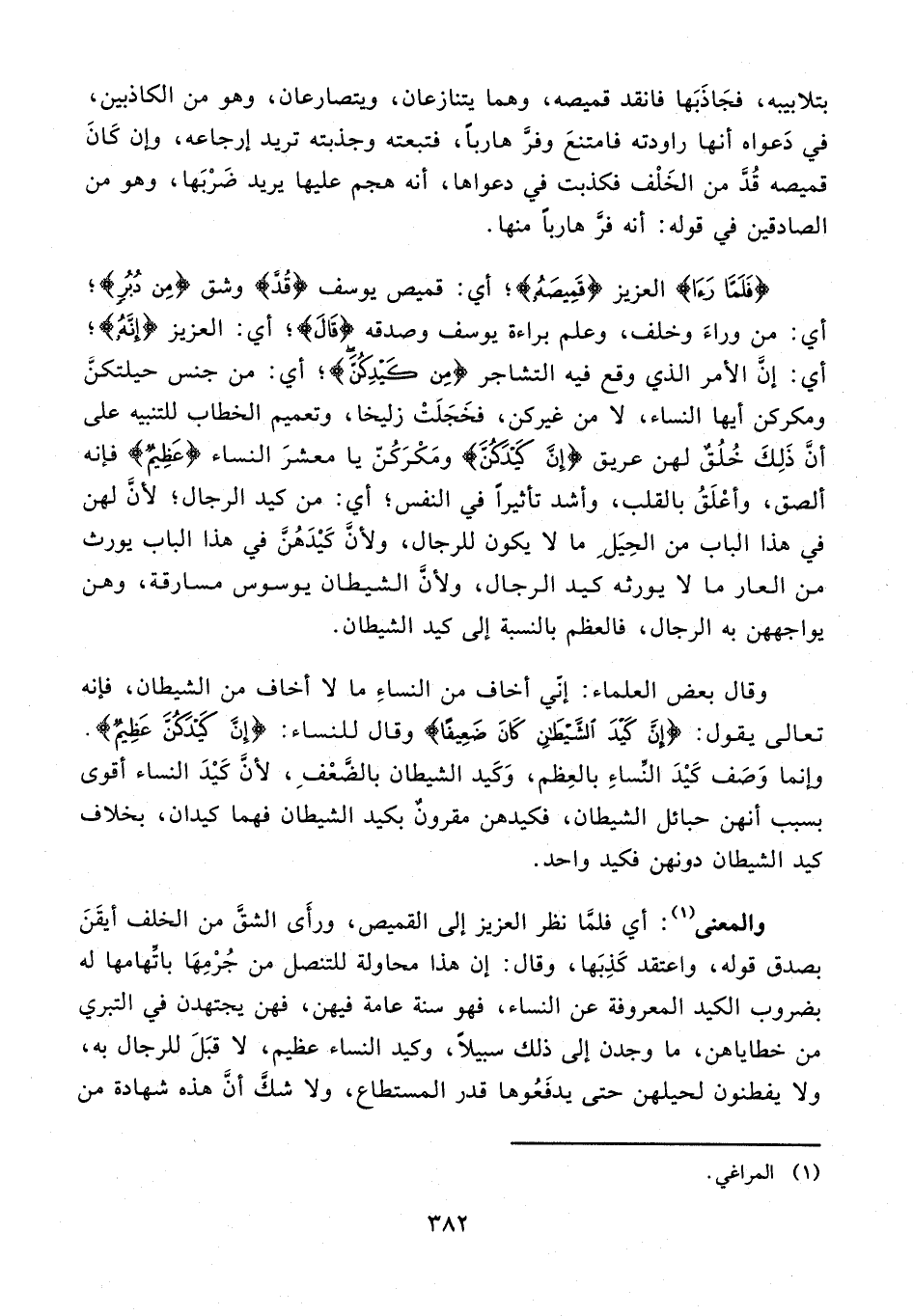 28 - {فَلَمَّا رَأَى} العزيز {قَمِيصَهُ} أي: قميص يوسف {قُدَّ} وشق {مِنْ دُبُر}؛ أي: من وراءَ وخلف، وعلم براءة يوسف وصدقه {قَالَ}؛ أي: العزيز {إِنَّهُ}؛ أي: إنَّ الأمر الذي وقع فيه التشاجر {مِنْ كَيْدِكُنَّ}؛ أي: من جنس حيلتكنَّ ومكركن أيها النساء، لا من غيركن، فخَجَلَتْ زليخا، وتعميم الخطاب للتنبيه على أنَّ ذَلِكَ خُلُقٌ لهن عريق {إِنَّ كَيْدَكُنَّ} ومَكْرَكُنّ يا معشرَ النساء {عَظِيمٌ} فإنه ألصق، وأعْلَقُ بالقلب، وأشد تأثيرًا في النفس؛ أي: من كيد الرجال؛ لأنَّ لهن في هذا الباب من الحِيَلِ ما لا يكون للرجال، ولأنَّ كَيْدَهُنَّ في هذا الباب يورث من العار ما لا يورثه كيد الرجال، ولأنَّ الشيطان يوسوس مسارقة، وهن يواجههن به الرجال، فالعظم بالنسبة إلى كيد الشيطان.