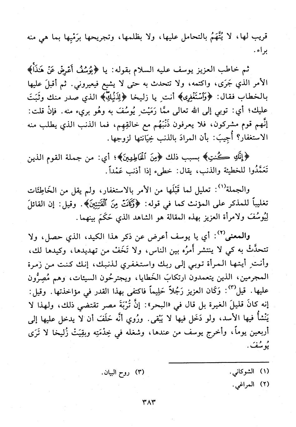 والمعنى (¬2): أي يا يوسف أعرض عن ذكر هذا الكيد، الذي حصل، ولا تتحدَّثْ به كي لا ينتشر أمرُه بين الناس، ولا تَخَفْ من تهديدها، وكيدها لك، وأنتِ أيتها المرأة توبي إلى ربك واستغفري لذنبك، إنك كنت من زمرة المجرمين، الذين يتعمدون ارتكابَ الخَطايا، ويجترحُون السيئات، وهم مُصِرُّون عليها. قيل (¬3): وَكَان العزيز رَجُلًا حَلِيمًا فاكتفى بهذا القدر في مؤاخذتها. وقيل: إنه كانَ قليلَ المغيرة بل قال في "البحر": إنَّ تُرْبَةَ مصر تقتضي ذلك، ولهذا لا يَنْشأُ فيها الأسد، ولو دَخَل فيها لا يَبْقى. ورُوي أنَّه حَلَفَ أن لا يدخل عليها إلى أربعين يومًا، وأخرج يوسف من عندها، وشغله في خِدْمَتِه وبقِيَتْ زُليخا لا تَرَى يُوسُفَ.
