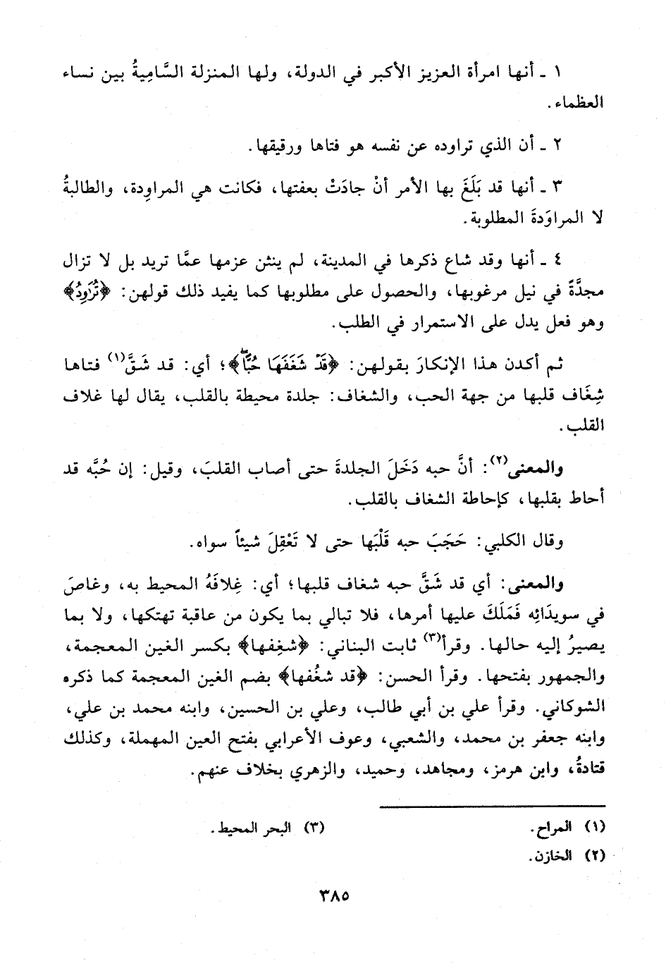 والمعنى: أي قد شَقَّ حبه شغاف قلبها؛ أي: غِلافَهُ المحيط به، وغاصَ في سويدَائِه فَمَلَكَ عليها أمرها، فلا تبالي بما يكون من عاقبة تهتكها, ولا بما يصيرُ إليه حالها. وقرأ (¬3) ثابت البناني: {شغِفها} بكسر الغين المعجمة، والجمهور بفتحها. وقرأ الحسن: {قد شغُفها} بضم الغين المعجمة كما ذكره الشوكاني. وقرأ علي بن أبي طالب، وعلي بن الحسين، وابنه محمَّد بن علي، وابنه جعفر بن محمَّد، والشعبي، وعوف الأعرابي بفتح العين المهملة، وكذلك قتادةُ، وابن هرمز، ومجاهد، وحميد، والزهرى بخلاف عنهم.