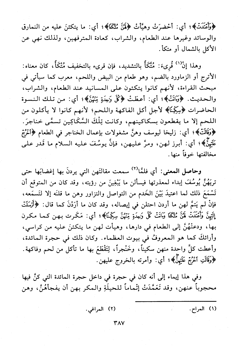 وهذا إنْ (¬1) قُرِىءَ: مُتَّكَأً بالتشديد، فإن قرئ بالتخفيف مُتْكَأً، كان معناه: الأترج أو الزماورد بالضم، وهو طعام من البيض واللحم، معرب كما سيأتي في مبحث القراءة؛ لأنهم كانوا يتكئون على المسانيد عند الطعام، والشراب، والحديث. {وَآتَتْ}؛ أي: أعطَتْ {كُلَّ وَاحِدَةٍ مِنْهُنَّ}؛ أي: من تلك النسوة الحاضرات {سِكِّينًا} لأجل أكل الفاكهة واللحم؛ لأنهم كانوا لا يأكلون من اللحم إلا ما يقطعون بسكاكينهم، وكانت تِلْكَ السَّكَاكِين تسمَّى خناجرَ. {وَقَالَتِ}؛ أي: زليخا ليوسف وهنَّ مشغولات بإعمال الخناجر في الطعام {اخْرُجْ عَلَيْهِنَّ}؛ أي: أبرز لهن، ومرَّ عليهن، فإنَّ يوسُفَ عليه السلام ما قَدر على مخالفتها خوفًا منها.
