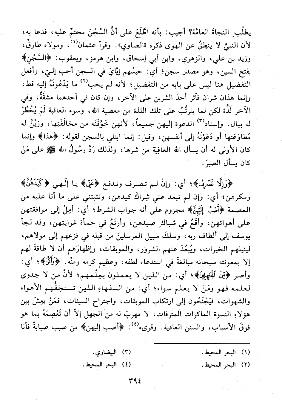 يطلُبِ النجاةَ العامَّة؟ أجيب: بأنه اطَّلَعَ على أنَّ السِّجْنَ محتمٌ عليه، فدعا به، لأن النبيَّ لا ينطِقُ عن الهوى ذكره "الصاوي". وقرأ عثمان (¬1)، ومولاه طارقٌ، وزيد بن علي، والزهري، وابن أبي إسحاق، وابن هرمز، ويعقوب: {السَّجْنِ} بفتح السين، وهو مصدر سجن؛ أي: حبسُهم إيَّايَ في السجن أحب إليّ، وأفعل التفضيل هنا ليس على بابه من التفضيل؛ لأنه لم يحب (¬2) ما يَدْعُونَهُ إليه قط، وإنما هذان شران فآثر أحدَ الشرين على الآخر، وإن كان في أحدهما مشقَّةٌ، وفي الآخر لَذَّة لكن لما يترتَّبُ على تلك اللذة من معصية الله، وسوء العاقبة لَمْ يُخْطُرْ له ببال. وإسناد (¬3) الدعوة إليهن جميعًا؛ لأنهن خَوَّفْنَه من مخالَفَتِها، وزيَّنَّ له مُطاوَعَتها أو دَعَوْنَهُ إلى أنفسهن، وقيل: إنما ابتلي بالسجن لقوله: {هذا} وإنما كان الأولى له أن يسأل الله العافِيَة من شرها, ولذلك رَدَّ رسُولُ الله - صلى الله عليه وسلم - على مَنْ كان يسأل الصبرَ.