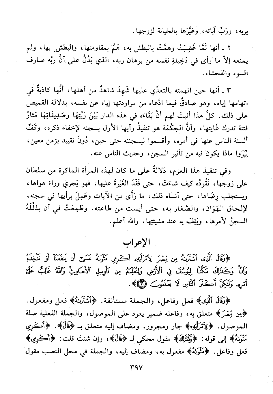 3 - أنها حين اتهمته بالتعدِّي عليها شَهِدَ شاهدٌ من أهلها، أنَّها كاذبةٌ في اتهامها إياه، وهو صادقٌ فيما ادَّعاه من مراودتها إياه عن نفسه، بدلالة القميص على ذلك. كلُّ هذا أثبتَ لهم أنَّ بَقَاءَه في هذه الدار بَيْنَ رَبَّتِهَا وصَدِيقَاتِهَا مَثارُ فتنة تدرك غَايتها، وأنَّ الحِكْمَة هو تنفيذُ رأيها الأول بسجنه لإخفاء ذكره، وكَفِّ ألسنة الناس عنها في أمره، وأقسموا ليسجننه حتى حين، دُونَ تقييد بزمن معين، ليَرَوا ماذا يكون فيه من تأثير السجن، وحديث الناس عنه.